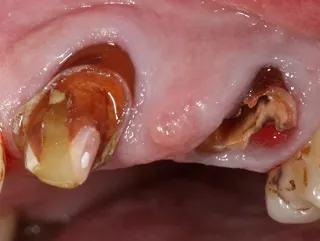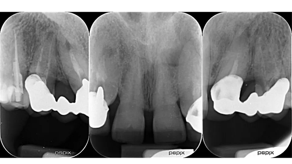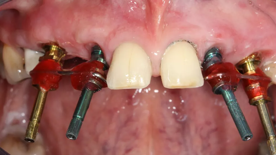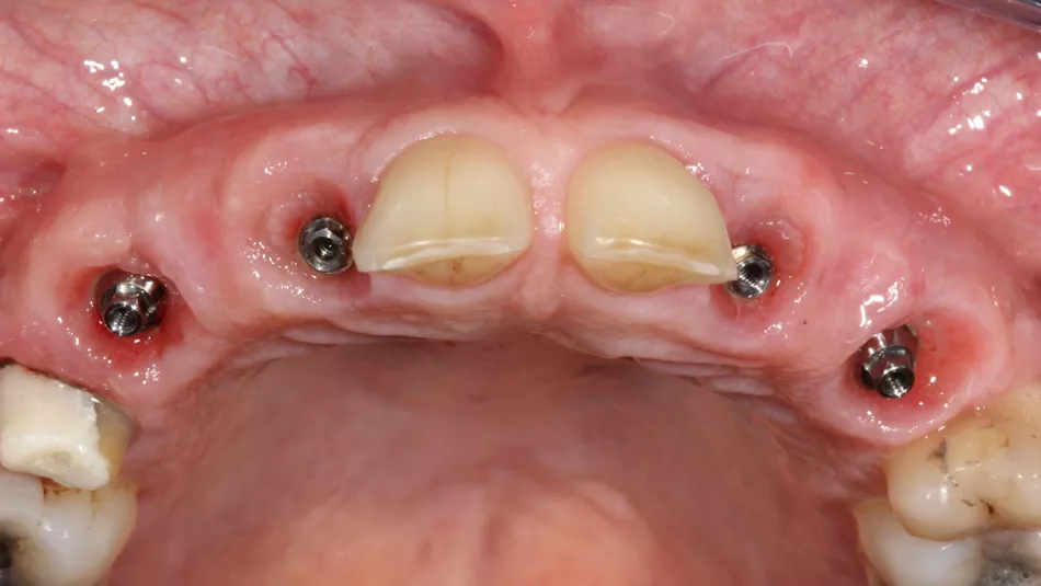 1. The two mesially tipped upper canines and first premolars supported two bridges that had been remade 3 times. Repeated decementation in the upper left quadrant and an infection in 2018 made the patient decide to agree to the proposed implant treatment.