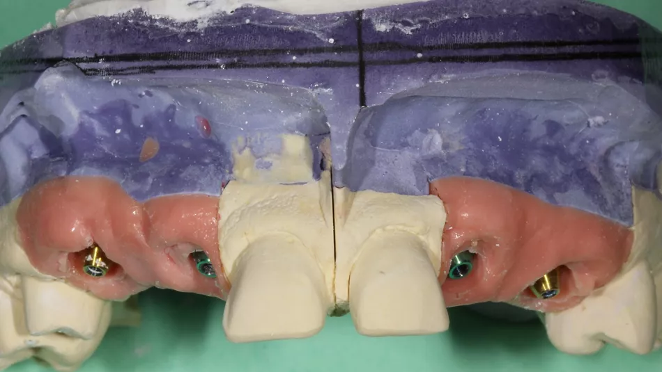 11. Working model. Once the wax-up had been fabricated, the emergence profile was sculpted in the pink silicone to create a transition between the ideal neck of the ceramic crowns and the Multi-Unit abutments. As the soft tissue had been thickened and the implant collars sat away from the vestibular bone margin, compression would have no harmful effects. Note the interpupillary line marked on the model (Ditramax®). We used it as a reference.