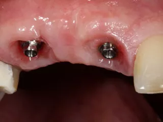 8a-b. 2 months follow-up. The healing screws were removed and replaced with Multi-Unit abutments. The abutments gingival height was 2.5 mm. 4 mm diameter abutments were used for lateral incisors and 4.8 mm platforms for the premolars. They were tightened to 25 N.cm. An initial impression was taken to prepare the temporary bridges.