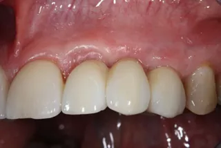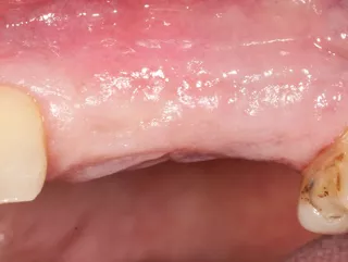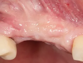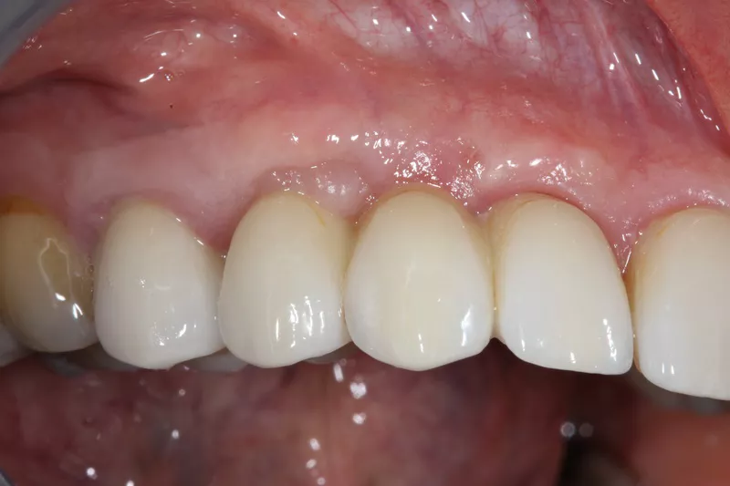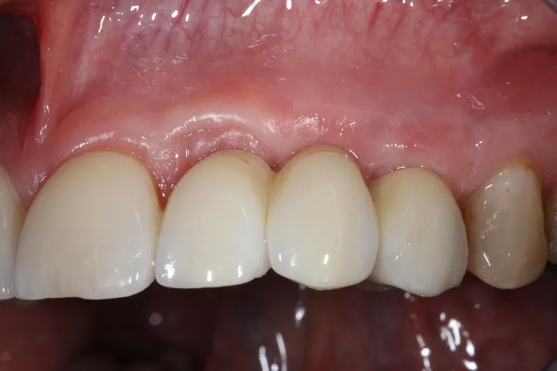 12. State of the soft tissues 8 months after insertion of the implants and 6 months after wearing bridges. Soft tissue volume was satisfactory. A crown was fitted to tooth 15.