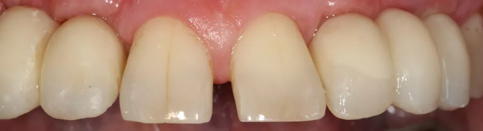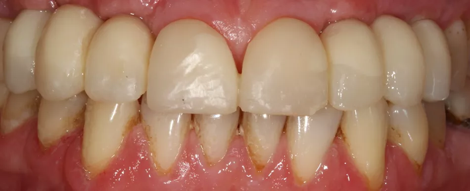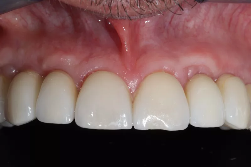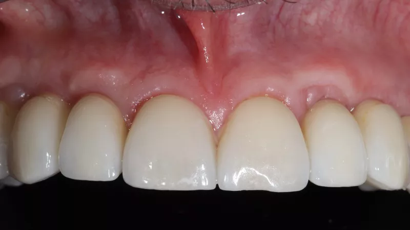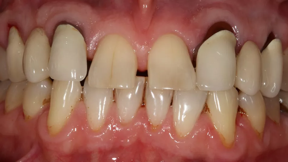 This 65-year-old patient was a non-smoker in good health. He presented with good periodontal status and a low (or maintained low) smile line. Many restorations had been carried out over time, without affecting occlusal function. There was a natural diastema between teeth 11 and 21. There were also two bridges, created to offset agenesis of the maxillary lateral incisors.