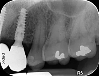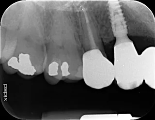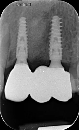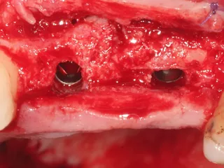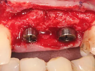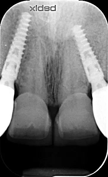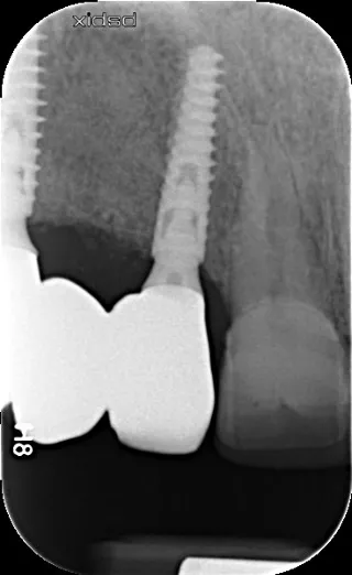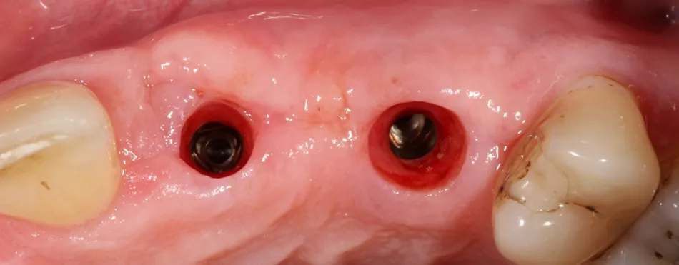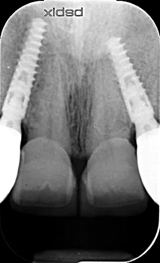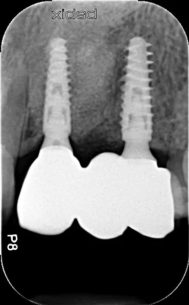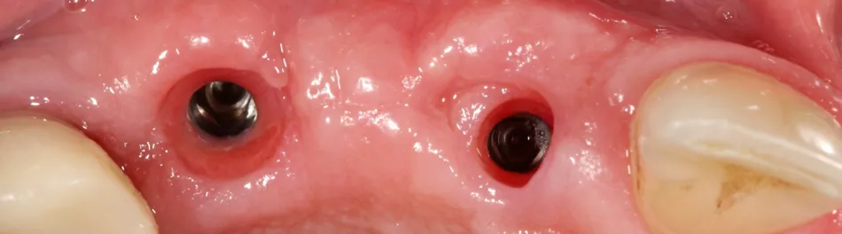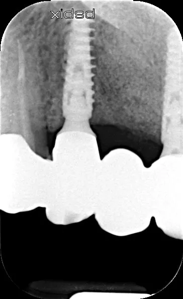 In this simple clinical situation, alveolar ridge preservation and alveolar bone filling made it possible to achieve favorable bone results. Post-extraction vestibular bone loss did not require bone volume augmentation and was offset by palatal connective tissue, which matured over the 6 months following the graft. The drilling sequence for Axiom X3® implants must be adapted to bone density, which is determined using an initial Ø 2 mm drill. In our patient the drilling protocol was adapted to D2-D3 bone, with the final drill being unnecessary. Indeed, the implant’s design reduces insertion torque in the bone and favors primary stability. The primary stability that we achieved would have allowed immediate loading of the temporary bridges, thereby shortening the always problematic period of wearing a removable overdenture by 2 months. However, the time required for the ossification of alveolar bone and maturation of soft tissue cannot be shortened.