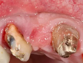 3a-b. Note the strip of keratinized gingiva and its 1 mm attachment. The roots were extracted. The sites were thoroughly debrided of all granulation tissue and filled with Bio-Oss® Collagen. Each site was hermetically resealed using a coronally positioned flap.