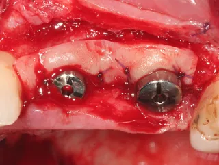 5a-b. Implants were placed away from the edge of the vestibular bone, 0.5 to 1.5 mm subcrestally, so that the implant collar lay 3 mm apical to the collar of the removable overdenture teeth. The design of the Axiom X3® implant limits insertion-related stresses in the bone and thus favors bone preservation. In this clinical situation of average bone density, the Axiom X3® drilling protocol is shortened without the need to use the final drill. Final insertion of each implant was carried out by hand using the ratchet wrench and primary stability was correct.
