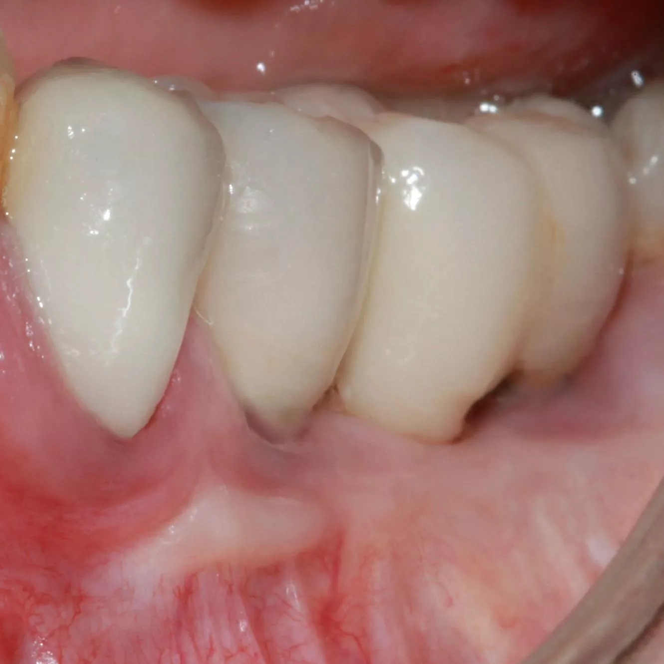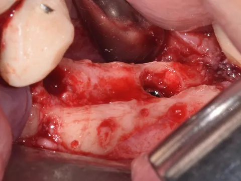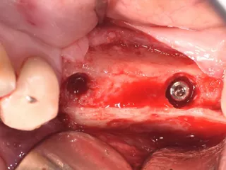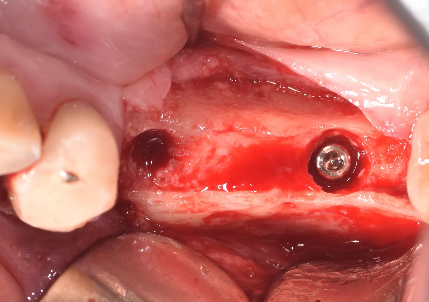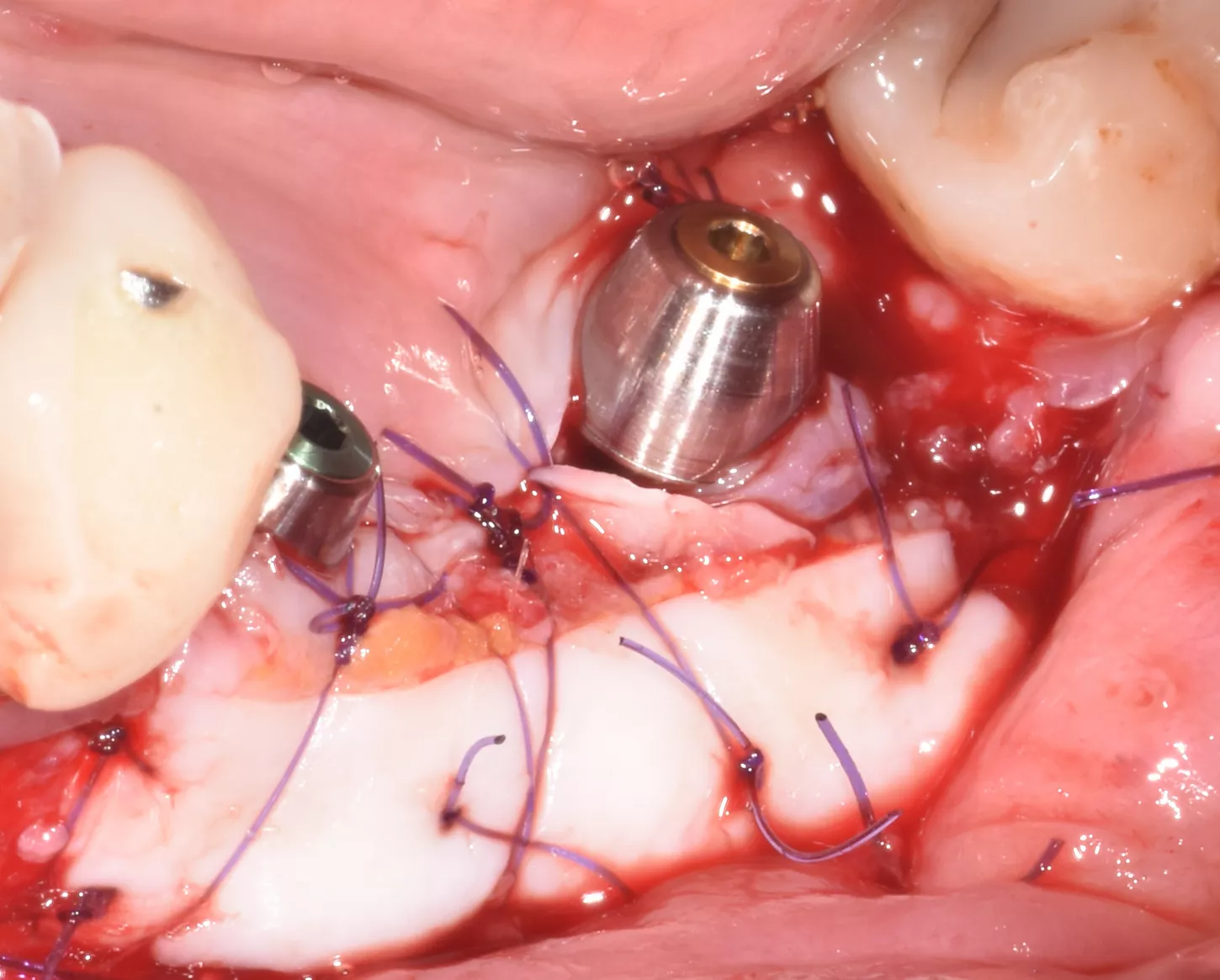 Bone was taken from the mandibular ramus, providing enough blocks for defects up to three teeth wide. It is preferred for horizontal or vertical augmentation and unilateral sinus augmentation [3]. Harvesting and grafting occurred in one surgery. Two Axiom X3® implants were placed 5 months after bone regeneration, followed by a connective epithelial graft 3 months later.
