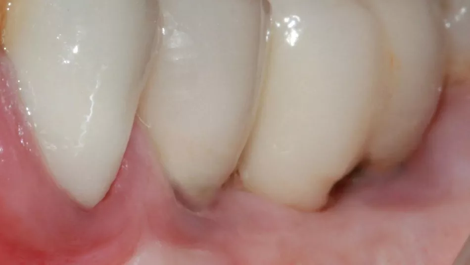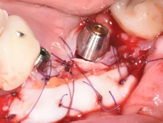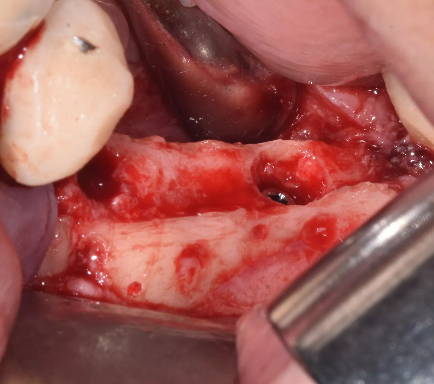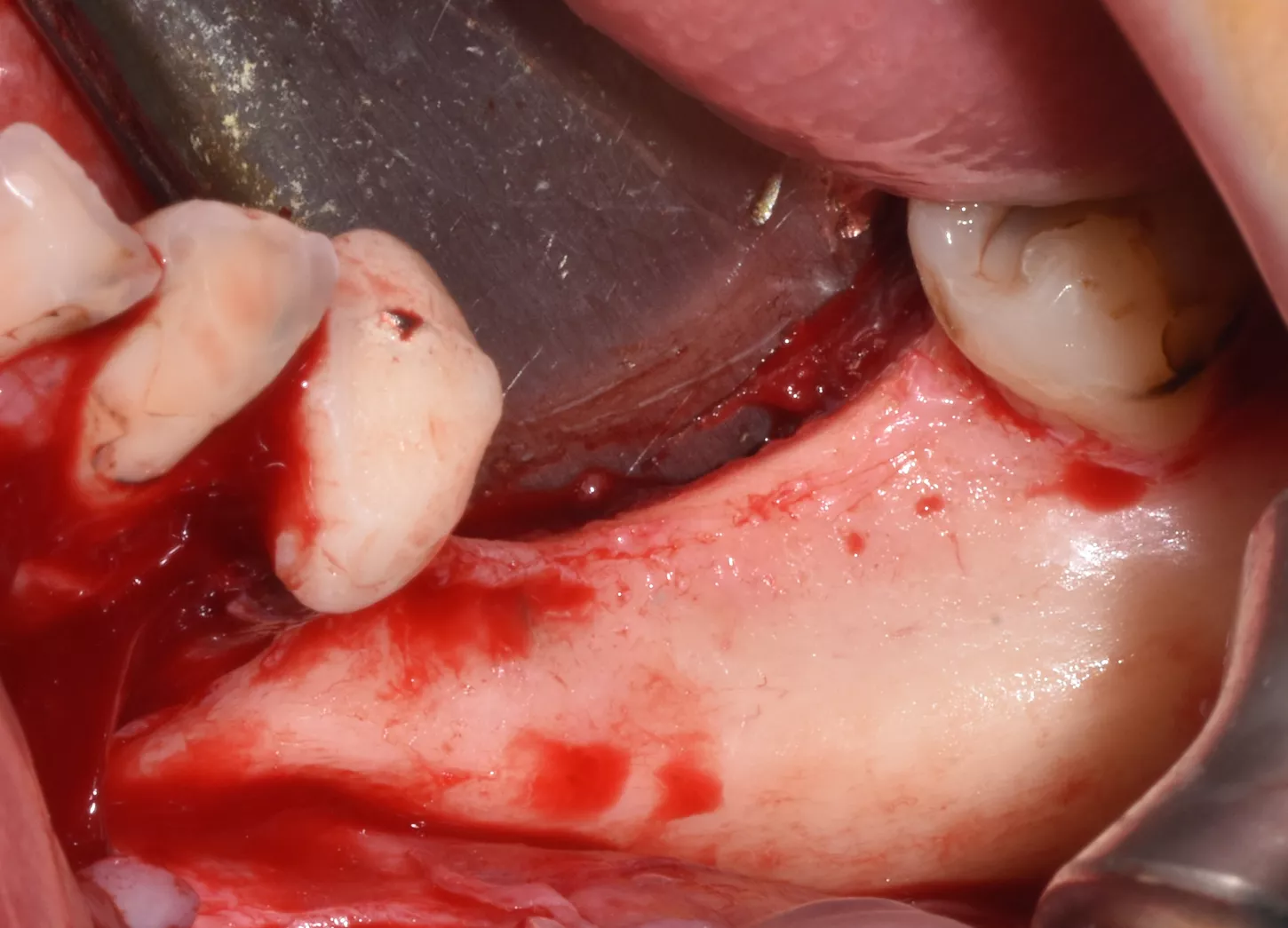 Bone was taken from the mandibular ramus, providing enough blocks for defects up to three teeth wide. It is preferred for horizontal or vertical augmentation and unilateral sinus augmentation [3]. Harvesting and grafting occurred in one surgery. Two Axiom X3® implants were placed 5 months after bone regeneration, followed by a connective epithelial graft 3 months later.