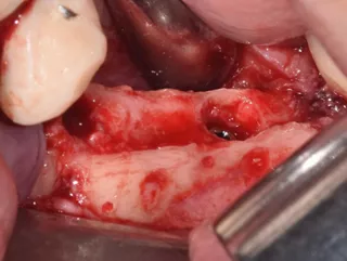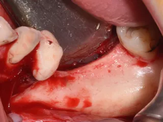 A 38-year-old patient presents for oral surgery consultation referred by her dentist for the replacement of teeth 35 and 36. The patient is in good health, a smoker at the time of the consultation, with the will to quit. The initial CT scan shows significant bone atrophy in all three spatial directions (height 4 mm above the mental foramen, Cawood 5) with a low well-rounded ridge presentation [1]. The prosthetic project was to create two implant-supported crowns at sites 35 and 36. To regenerate the bone at the site, we opted for an autogenous bone graft protocol as described by Professor F. Khoury. The aim is to reconstruct the bone volume of the site in the horizontal and vertical directions with a high tolerance [2].