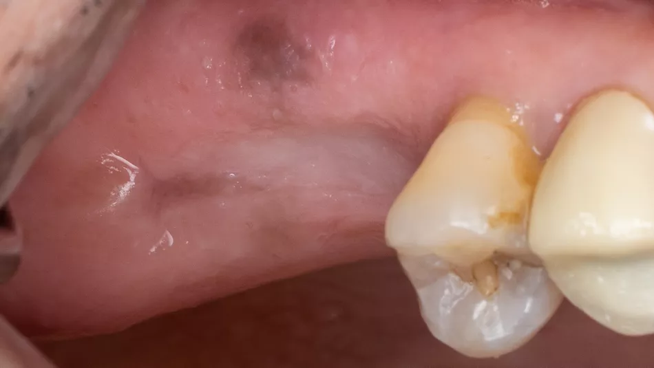 The occlusal view shows a ridge with a satisfactory width and a thick, healthy periodontal phenotype.