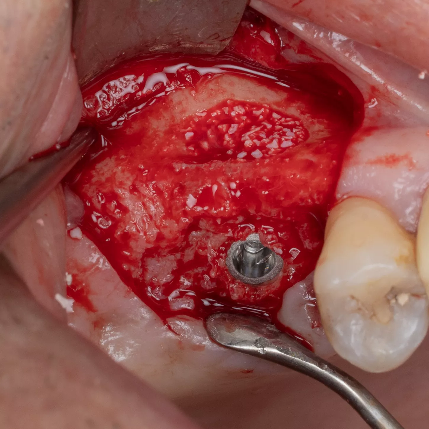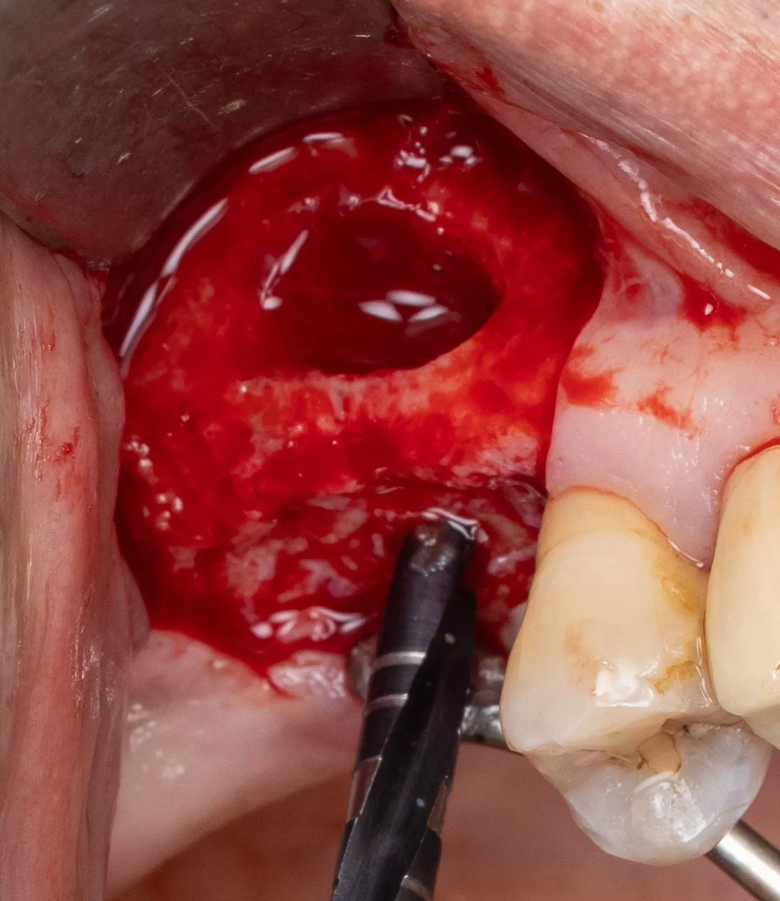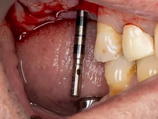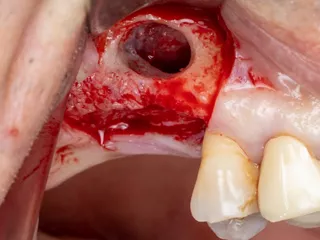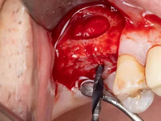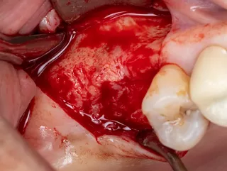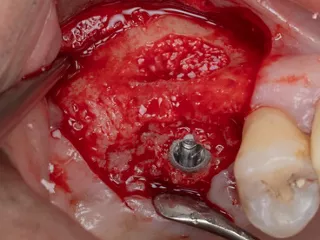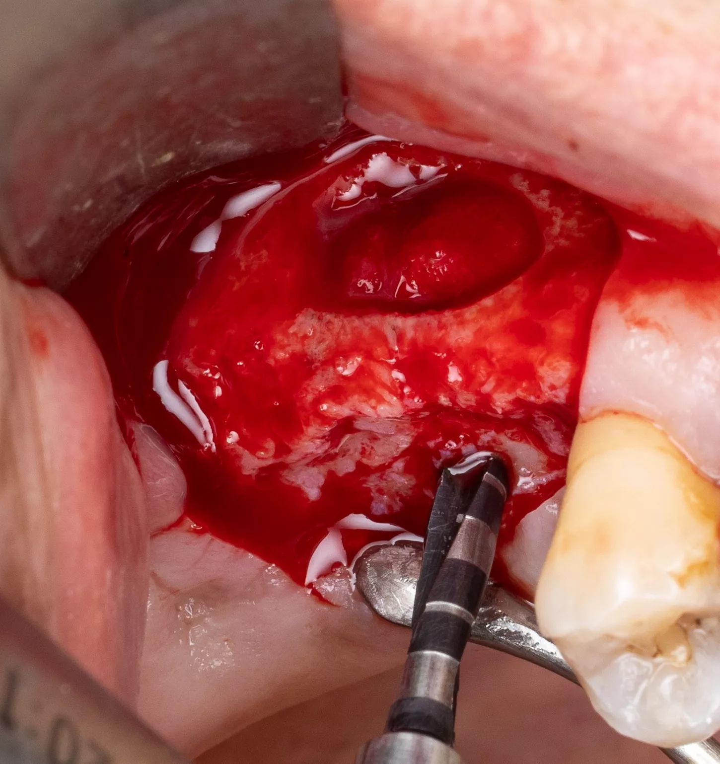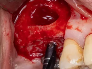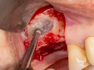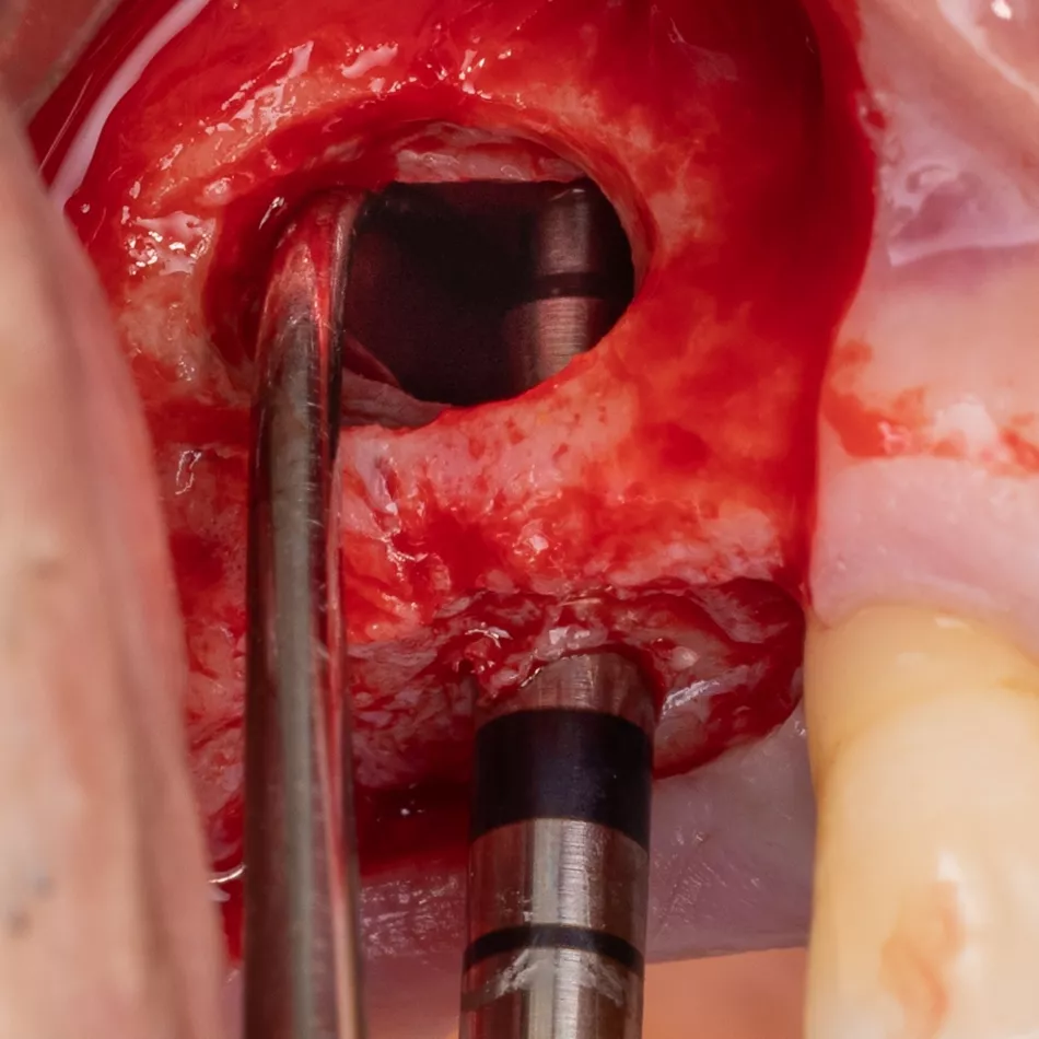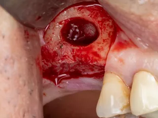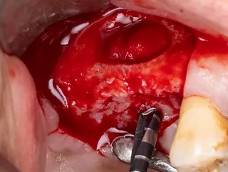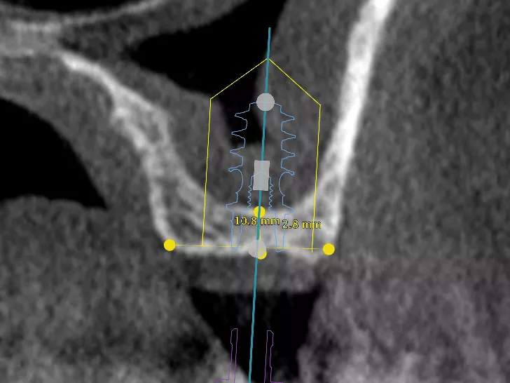 Upon examination, it was found that the patient had a broad crest and thick periodontal tissue with satisfactory gingival height. A cone beam examination confirmed that the width of the bone crest was 10.8 mm. However, the residual bone height was only 2.8mm, which was deemed insufficient for the planned implant (Axiom® BL X3 Ø 4mm, length 10mm) without hard tissue augmentation. Nonetheless, implant placement with a concomitant sinus lift can be considered when bone heights are ≥ 2 mm [1-4]. As a result, a surgical decision was made to place an Axiom X3® Bone Level implant to replace 16, along with a simultaneous sinus lift to facilitate both implant placement and bone regeneration in one procedure.