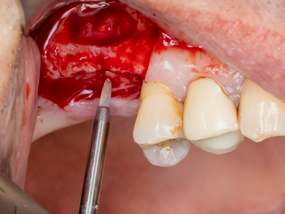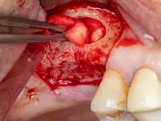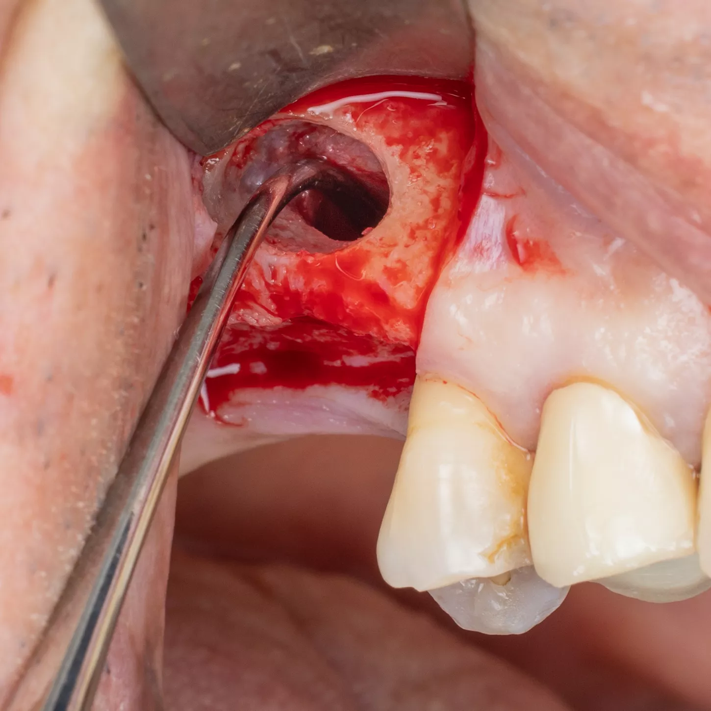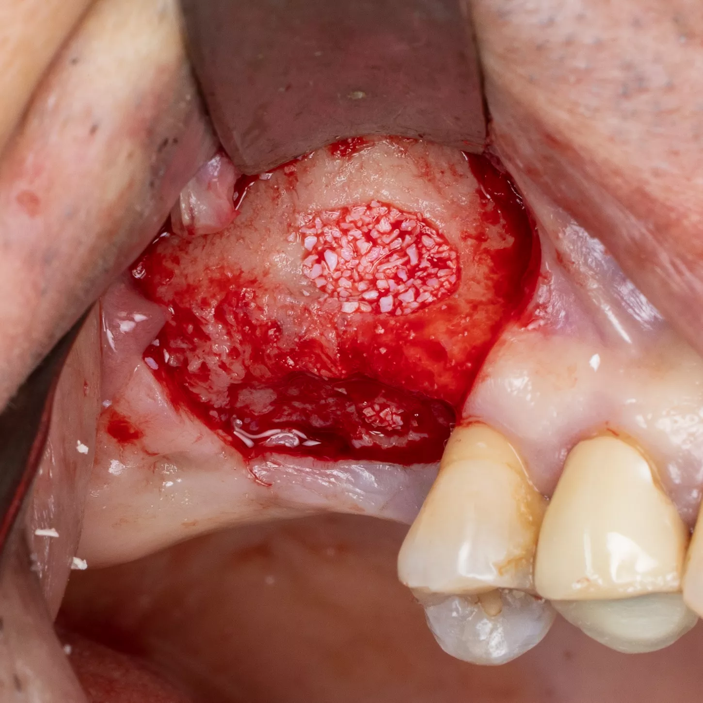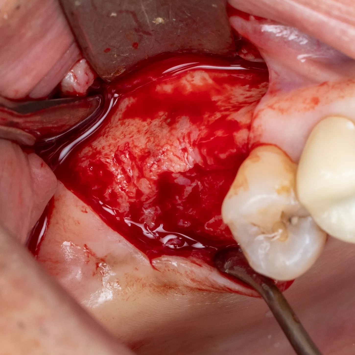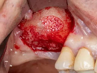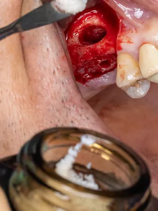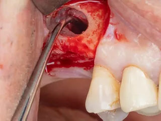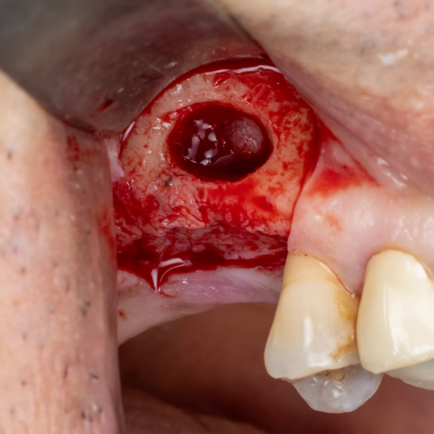 Upon examination, it was found that the patient had a broad crest and thick periodontal tissue with satisfactory gingival height. A cone beam examination confirmed that the width of the bone crest was 10.8 mm. However, the residual bone height was only 2.8mm, which was deemed insufficient for the planned implant (Axiom® BL X3 Ø 4mm, length 10mm) without hard tissue augmentation. Nonetheless, implant placement with a concomitant sinus lift can be considered when bone heights are ≥ 2 mm [1-4]. As a result, a surgical decision was made to place an Axiom X3® Bone Level implant to replace 16, along with a simultaneous sinus lift to facilitate both implant placement and bone regeneration in one procedure.
