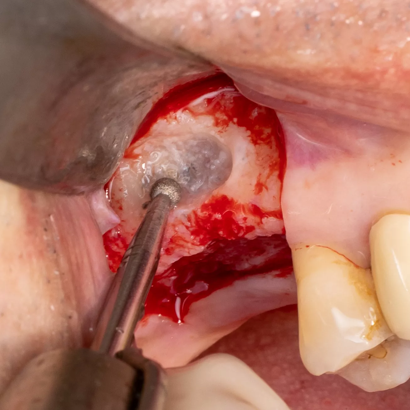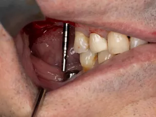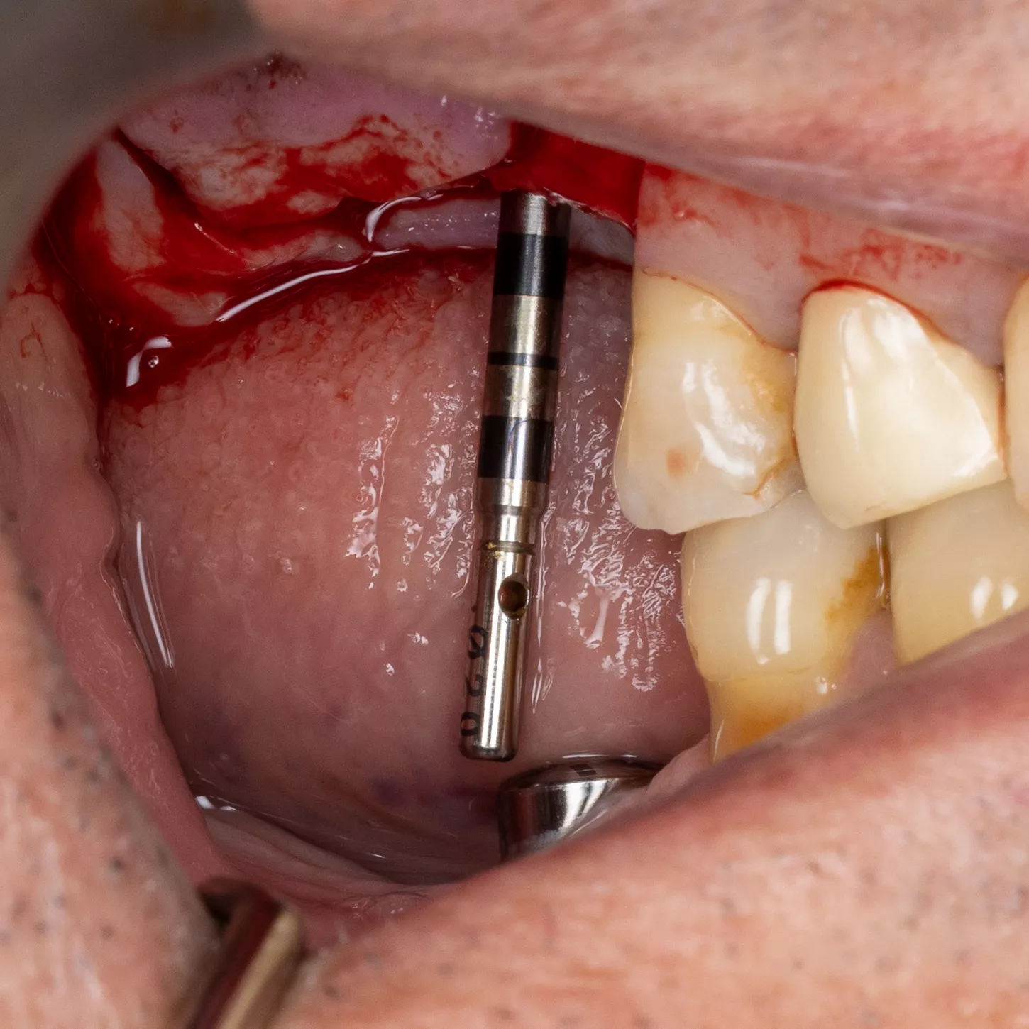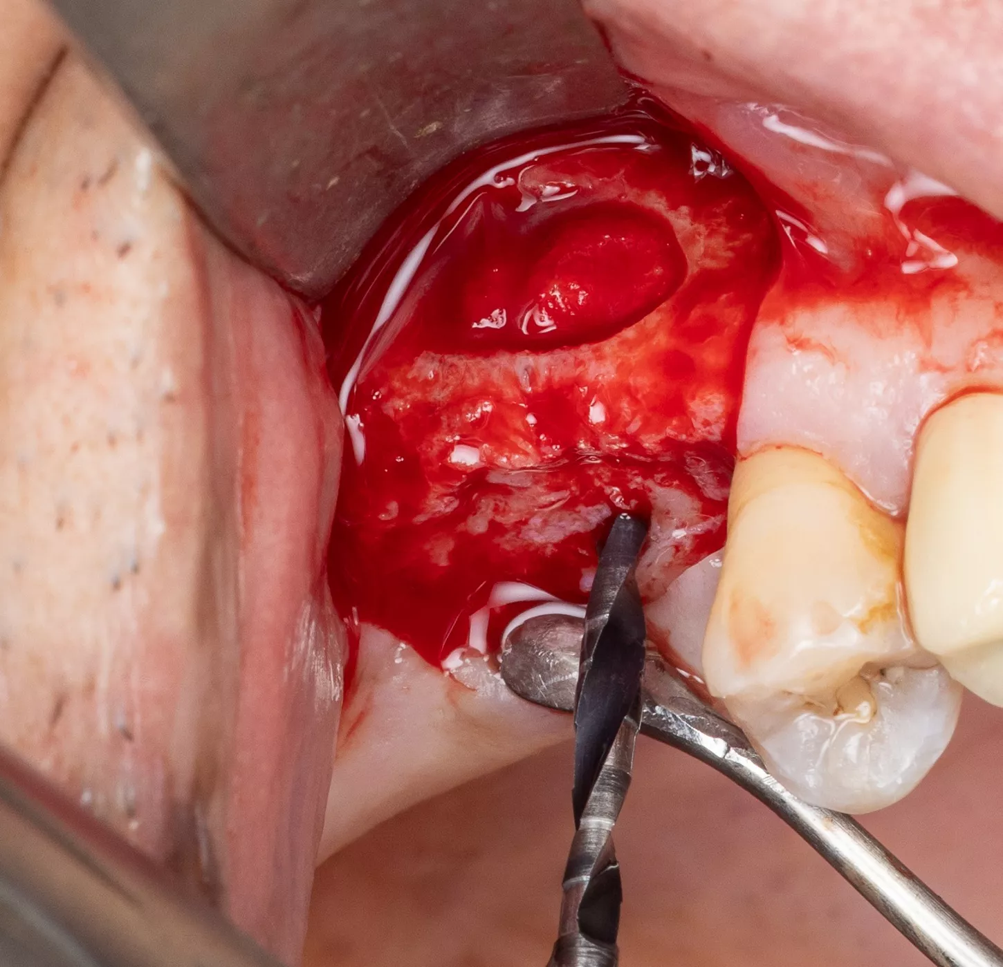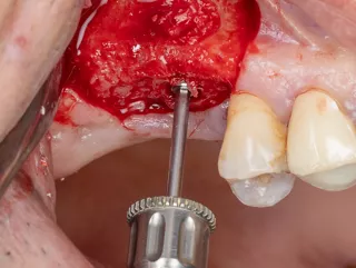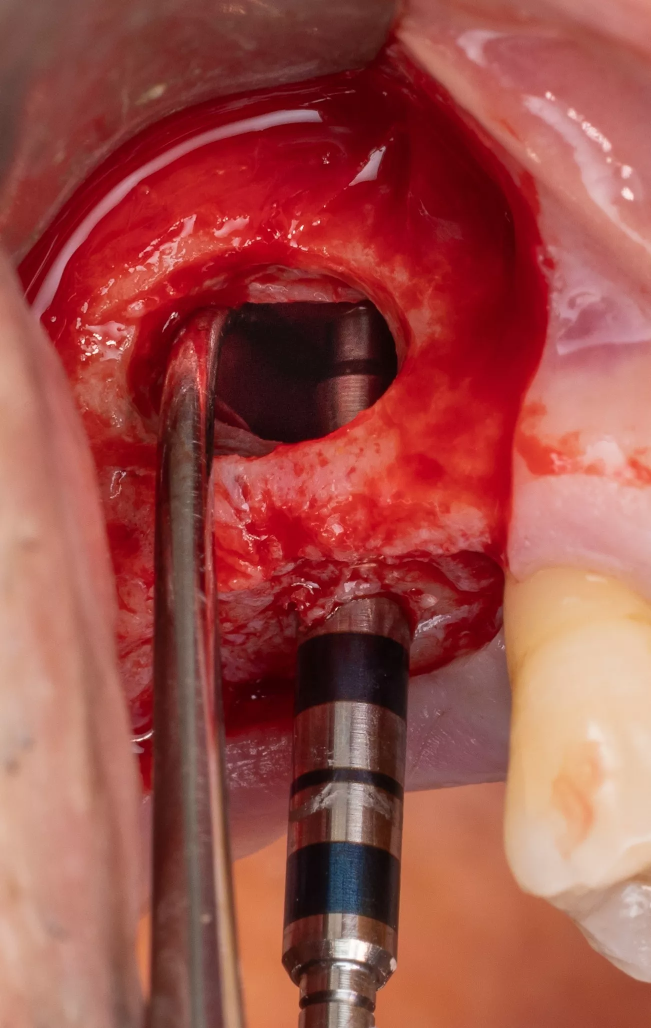 9. Placement of a new collagen sponge to protect the mucosa from the drill holes and start of the implant drilling sequence with the Pointer drill.