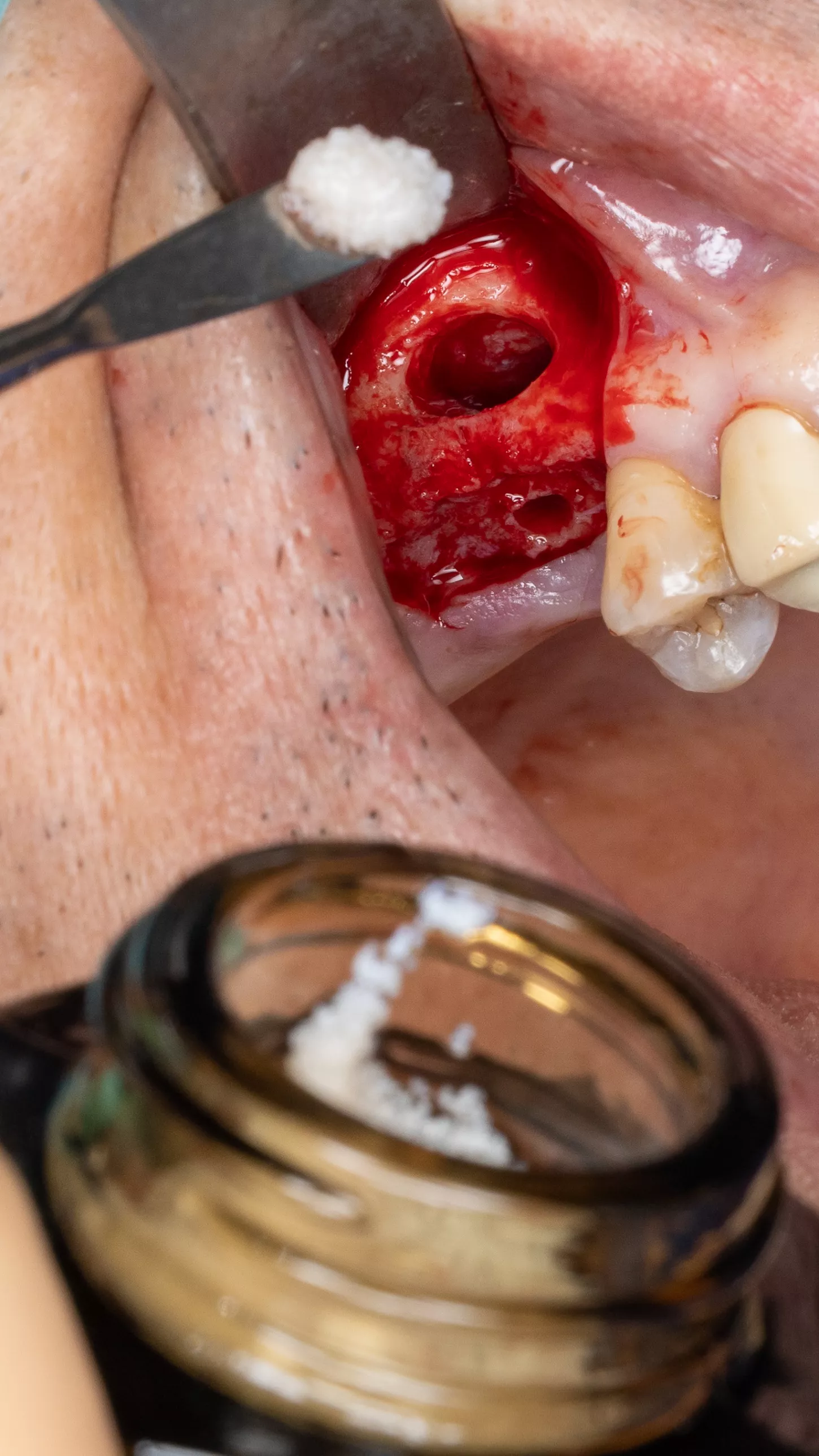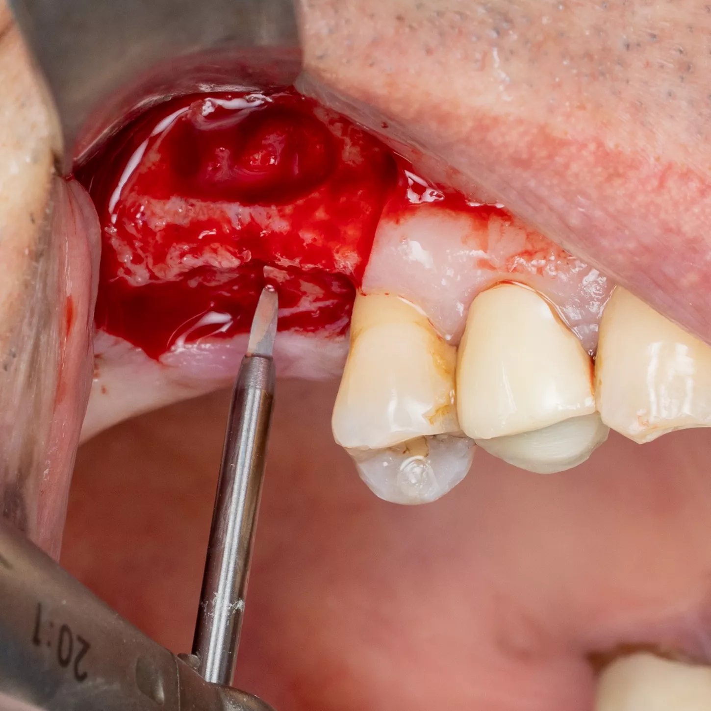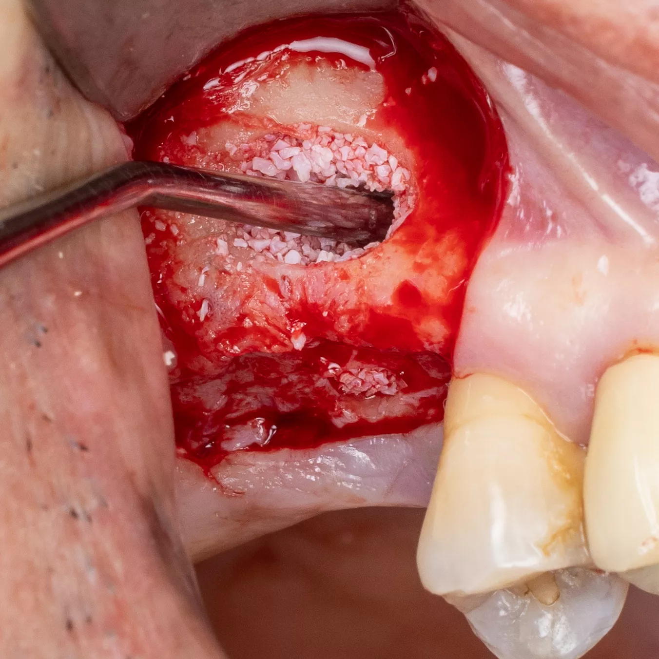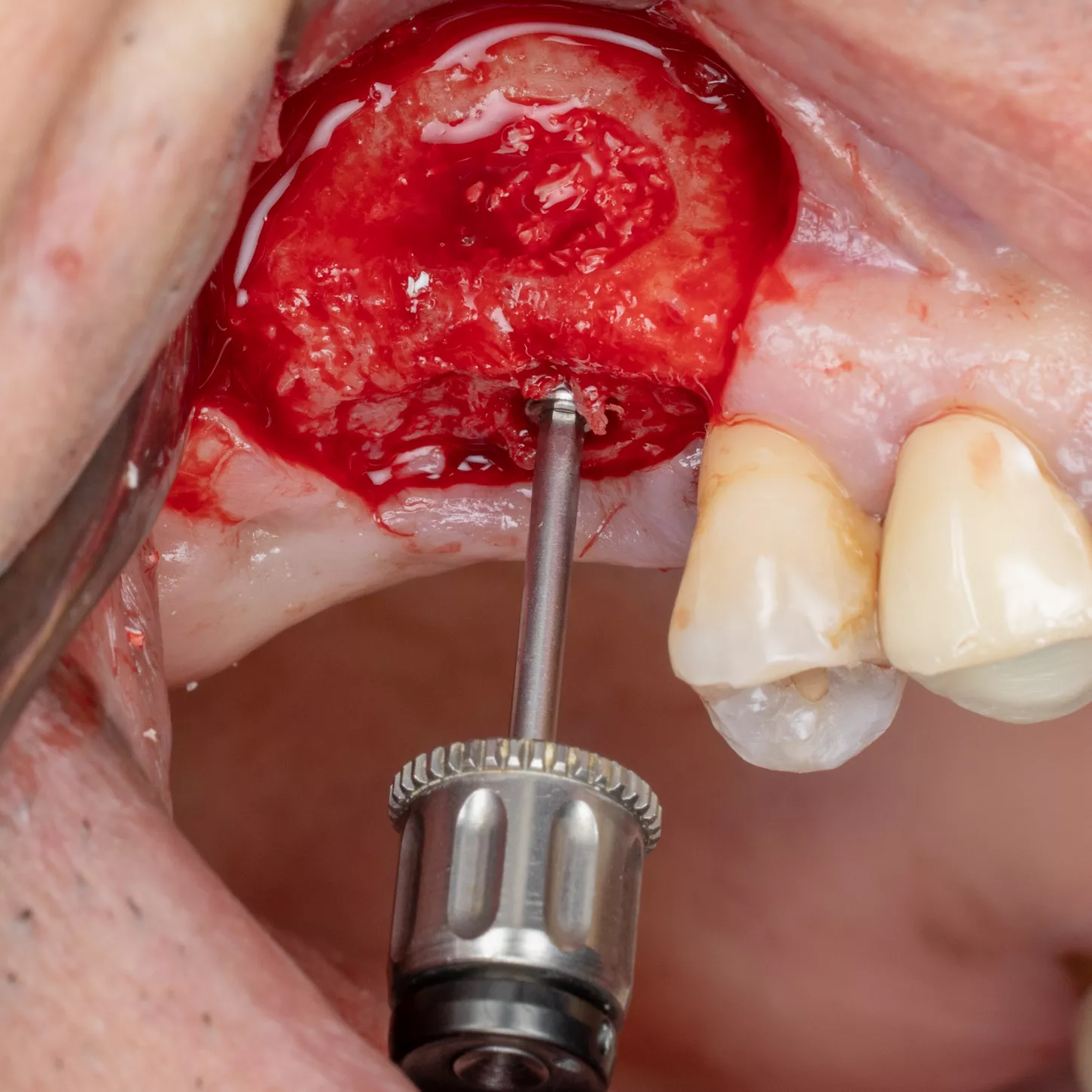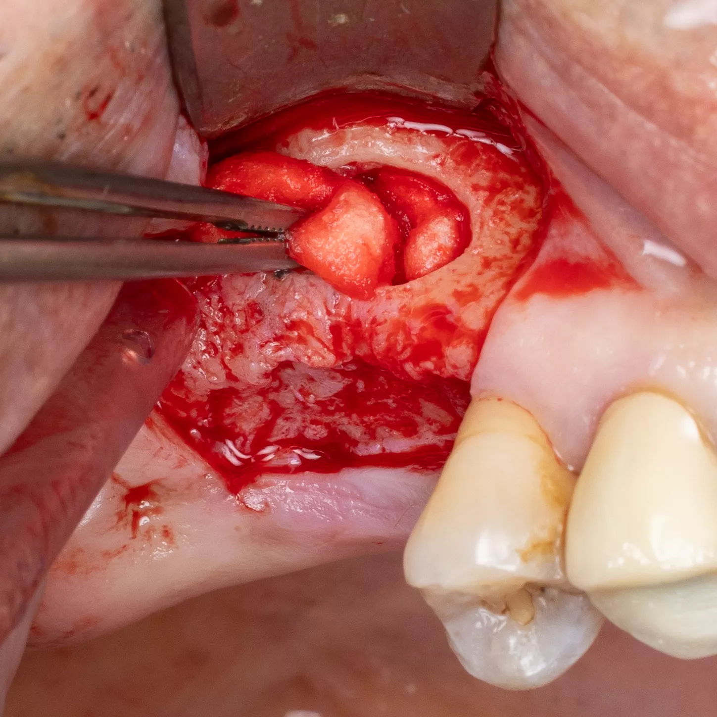 9. Placement of a new collagen sponge to protect the mucosa from the drill holes and start of the implant drilling sequence with the Pointer drill.