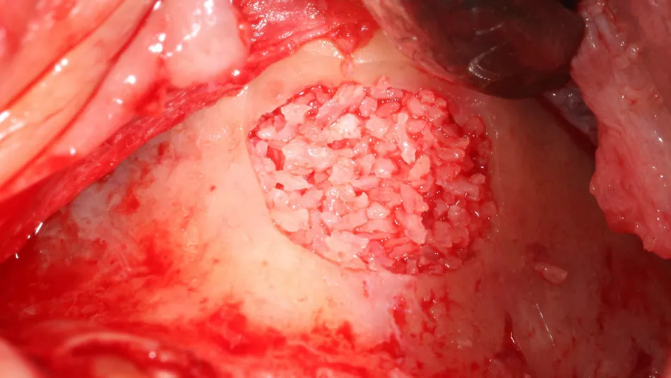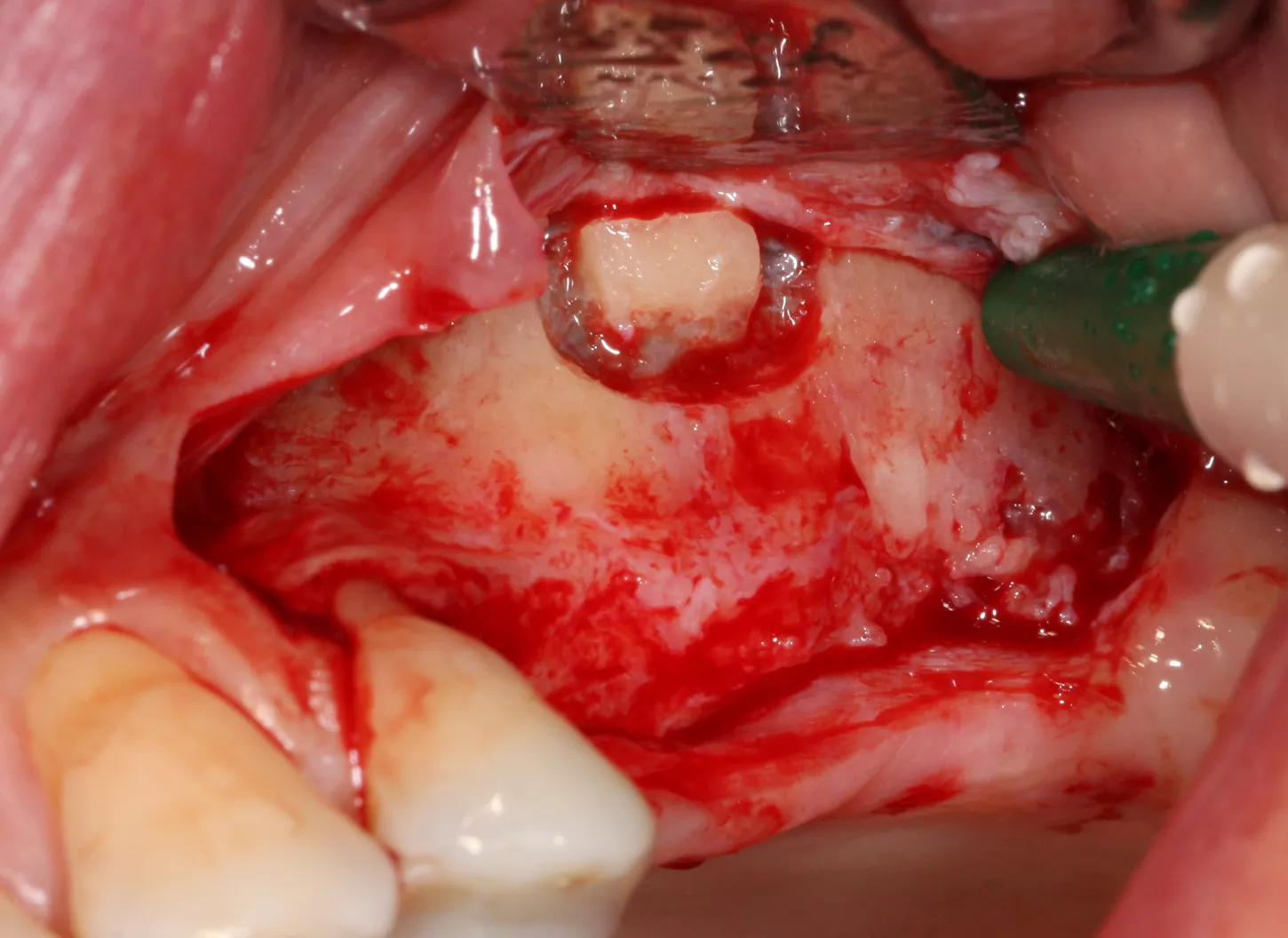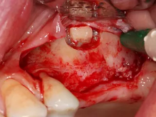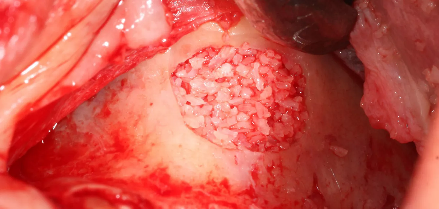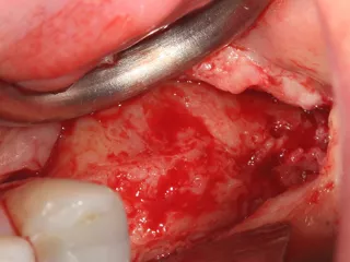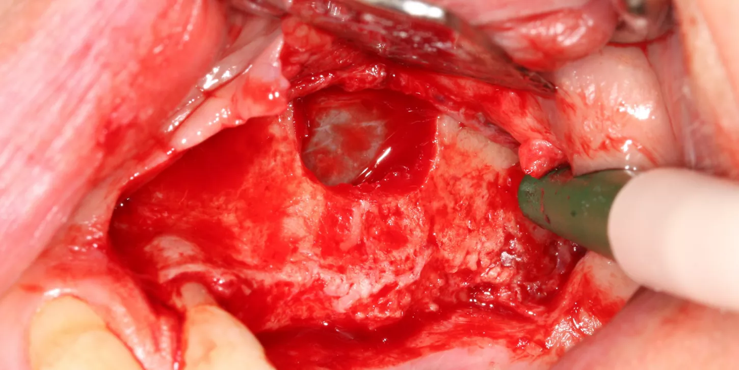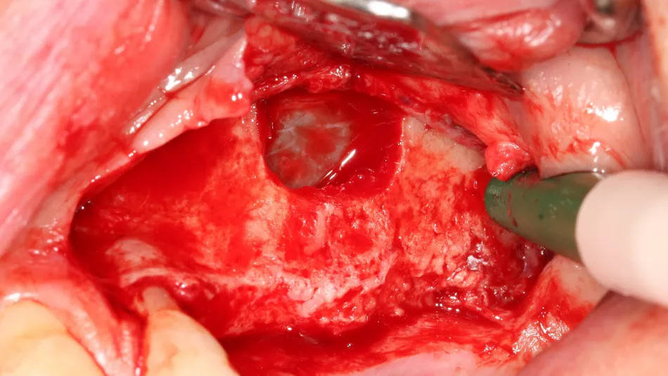 7. The bony window was removed and placed in saline solution so that it could be placed back in position after grafting. The Schneiderian membrane was released without perforation.