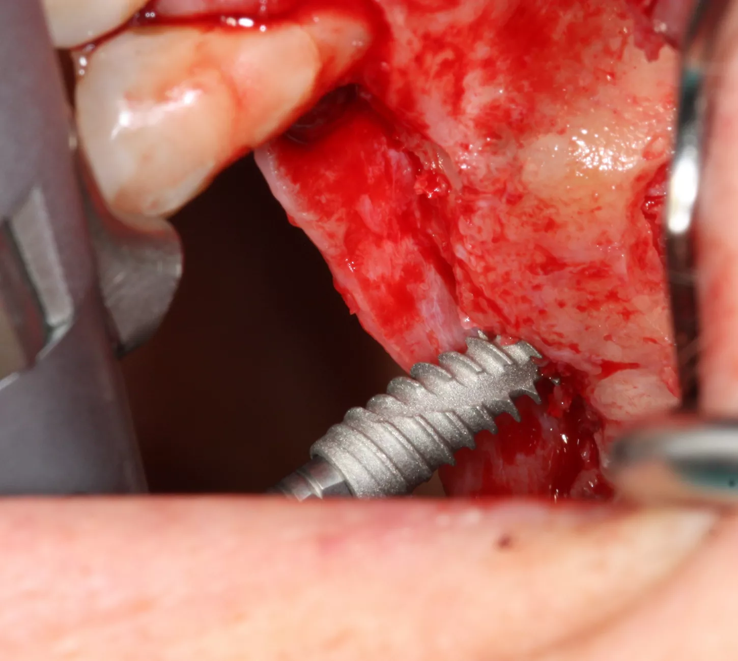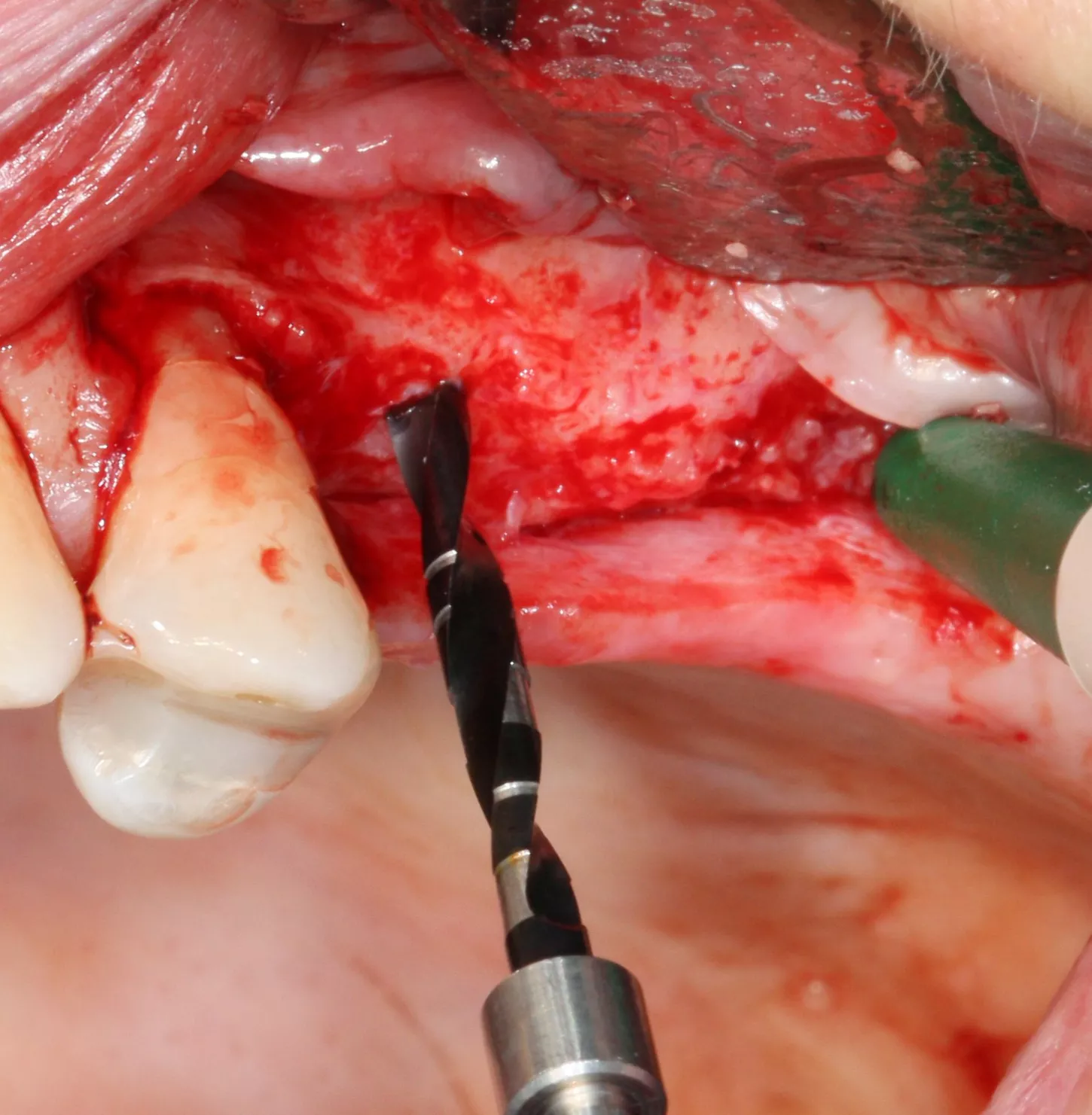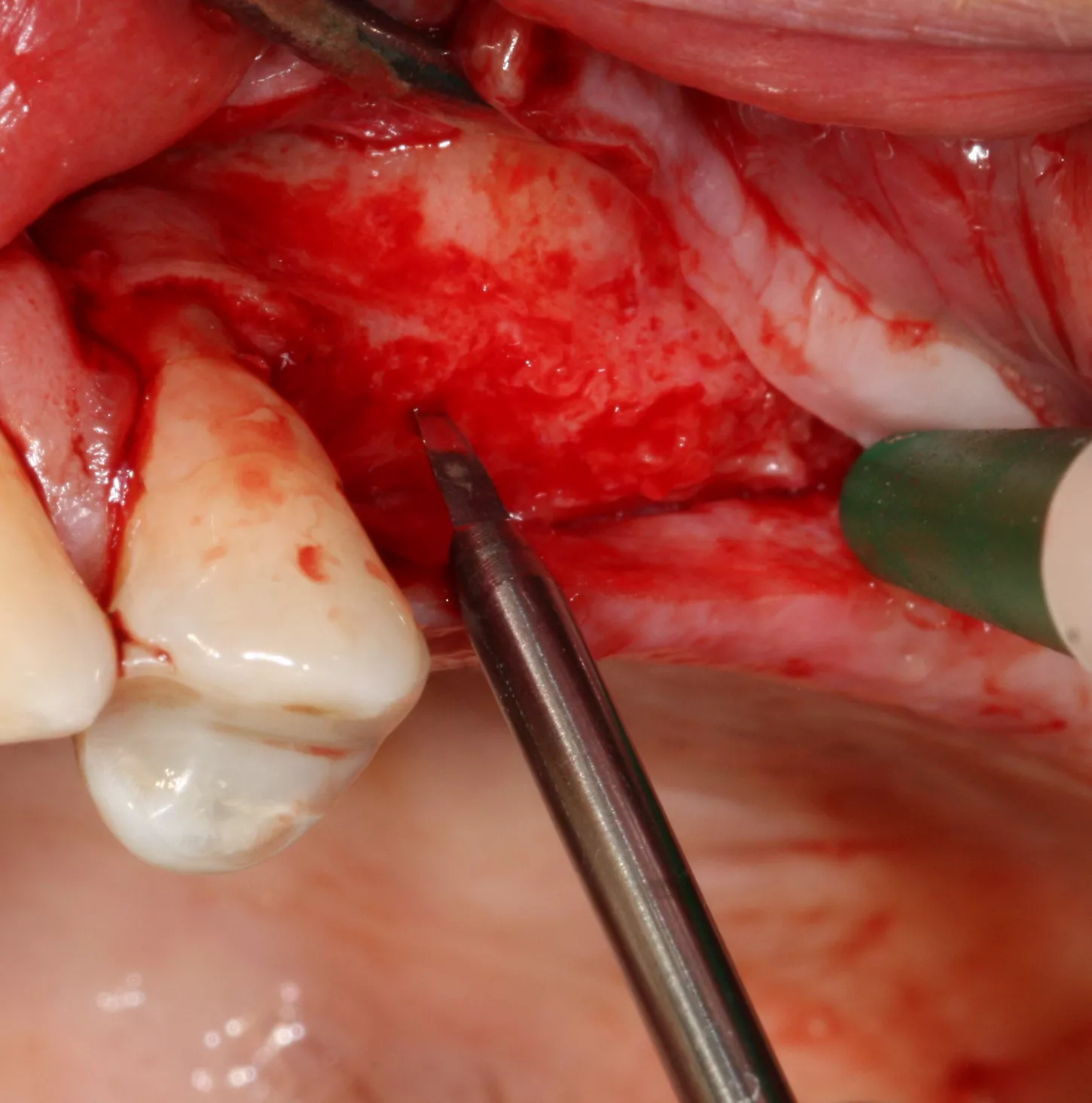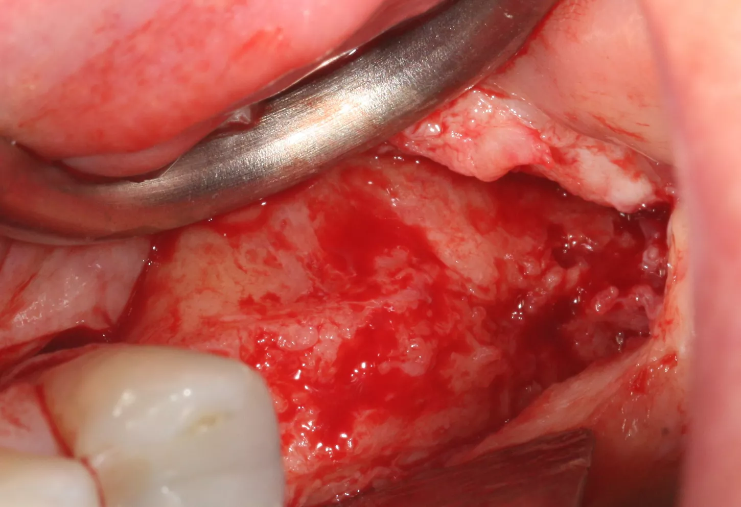 7. The bony window was removed and placed in saline solution so that it could be placed back in position after grafting. The Schneiderian membrane was released without perforation.