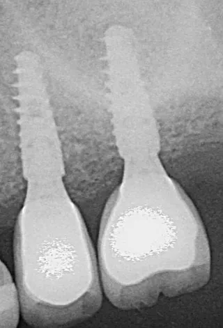 13. The implants were placed 0.5–1 mm subcrestally. Note the thinness of the vestibular cortical bone at the 25 implant on this occlusal view. Despite this, we achieved perfectly acceptable stability values of 19 and 20 Ncm.