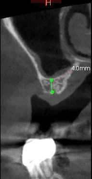 1-2. Panoramic radiography and cone-beam computed tomography showing vertical bone loss. With only 4 mm of sinus floor bone, implant placement was not feasible.