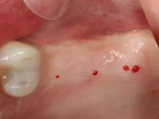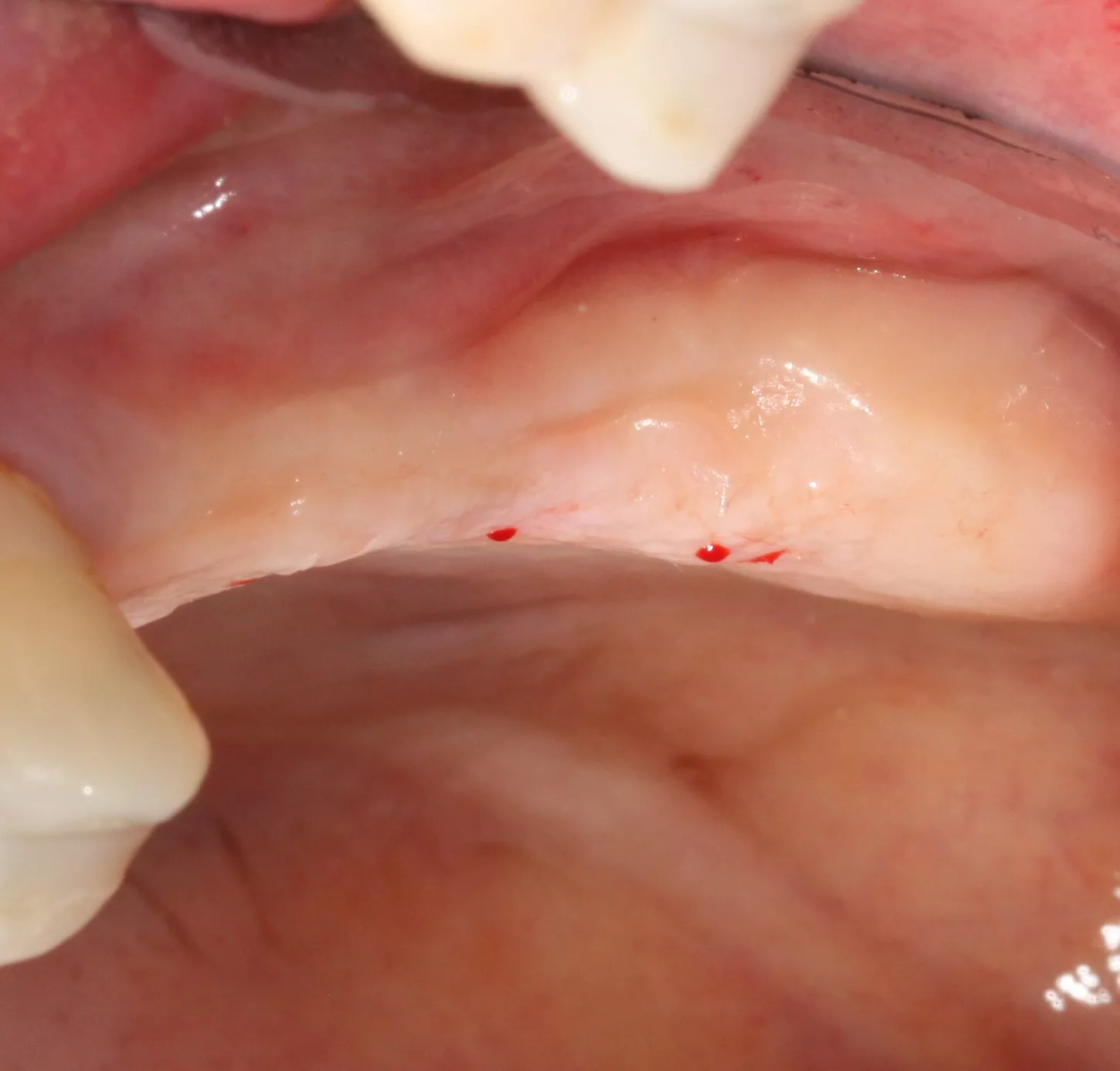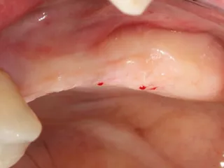 Free-end saddle. Periodontal tissue appeared healthy. Plenty of keratinized tissue. Notice the more extensive vestibular bone loss around 25.