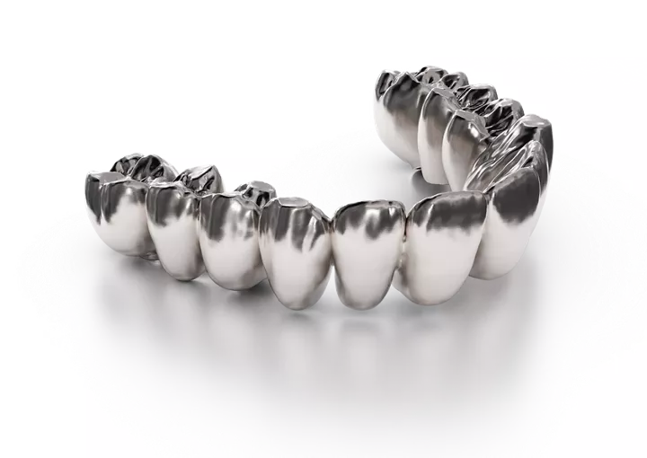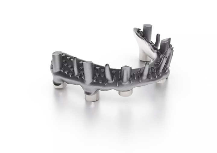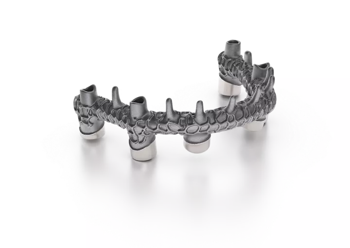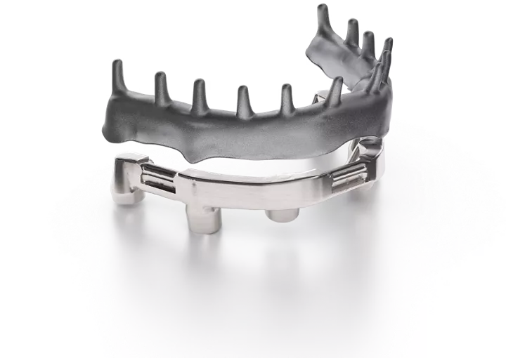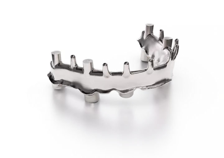 Armature en titane avec une surface rétentive pour la résine, des surfaces polies pour un contact muqueux et un bandeau en palatin/lingual, afin de réaliser une prothèse dentaire complète, en titane ou résine, avec des dents cosmétiques du commerce (en résine blanche) et de la fausse gencive (en résine rose).