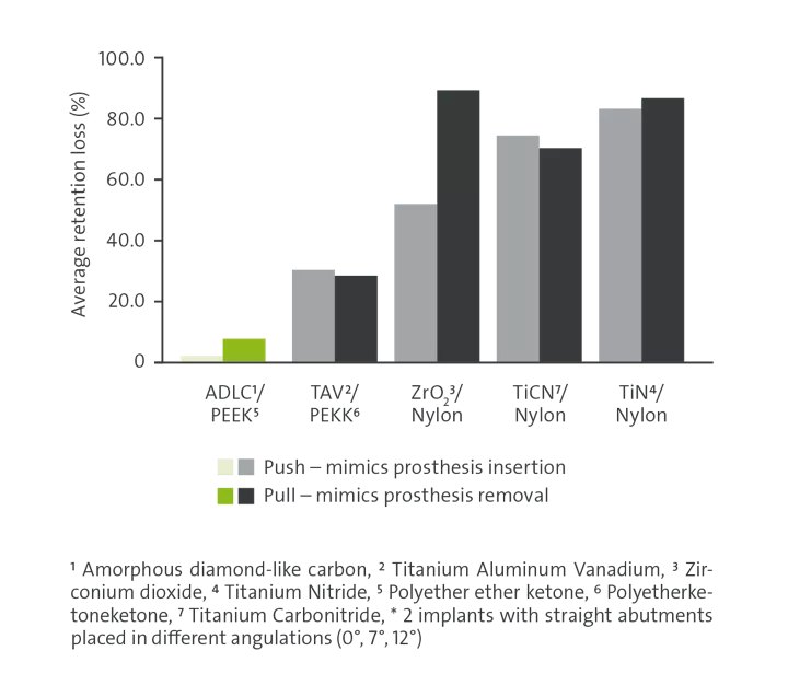 Retentionsverlust des geraden Sekundärteils nach 10.000 Zyklen in phosphatgepufferter Kochsalzlösung (pH 7,4) bei Raumtemperatur. Die Daten zeigen die Veränderungen in Prozent (%) zwischen der Basismessung (nach 100 Zyklen) und der finalen Messung (Fmax) (nach 10’000 Zyklen) (Quelle: -Straumann, Daten im Archiv).