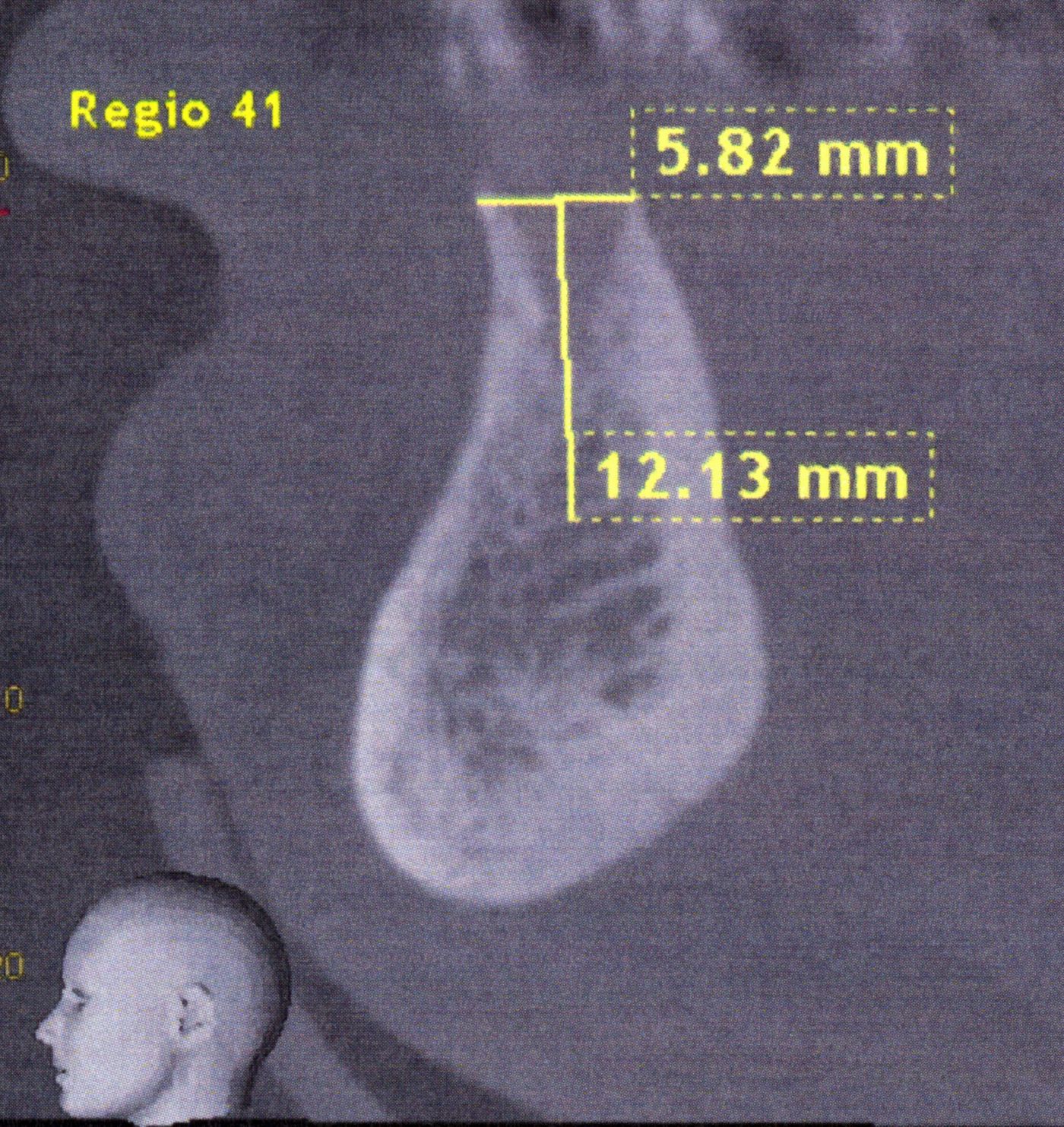 O dente 41 foi extraído, e um escaneamento de CBCT foi registrado nove semanas mais tarde. A avaliação radiográfica revelou uma quantidade adequada de osso nas dimensões vertical e horizontal (Figs. 2, 3). Por causa do espaço estreito na dimensão mésio-distal (Fig. 4), um implante Bone Level Tapered (BLT) com diâmetro reduzido de 2,9 mm foi selecionado para assegurar a limpeza adequada dos espaços interdentais.