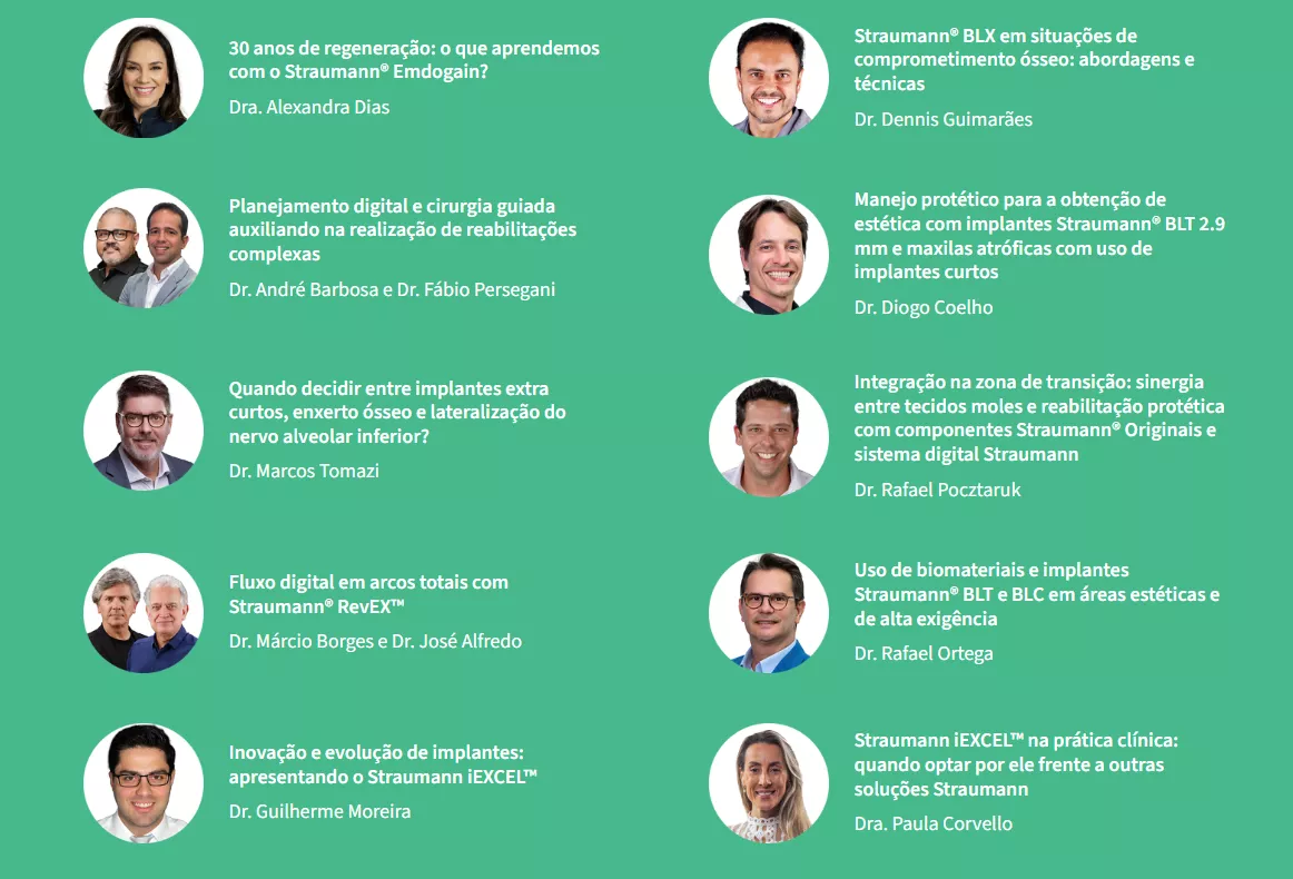 Além disso, os participantes terão acesso a uma verdadeira vitrine para os principais lançamentos e destaques tecnológicos da Straumann. É uma oportunidade singular para vivenciar, de perto, a excelência e o pioneirismo que definem a marca no cenário mundial da implantodontia.