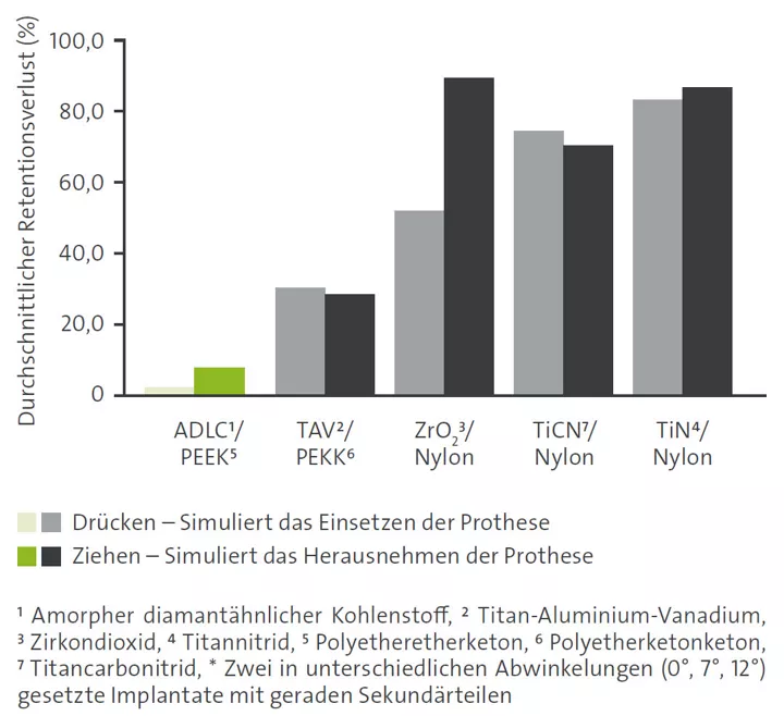 Retentionsverlust des geraden Sekundärteils nach 10’000 Zyklen in phosphatgepufferter Kochsalzlösung (pH 7,4) bei Raumtemperatur. Die Daten zeigen die Veränderungen in Prozent (%) zwischen der Basismessung (nach 100 Zyklen) und der finalen Messung (Fmax) (nach 10’000 Zyklen). (Quelle: Straumann, Daten im Archiv)