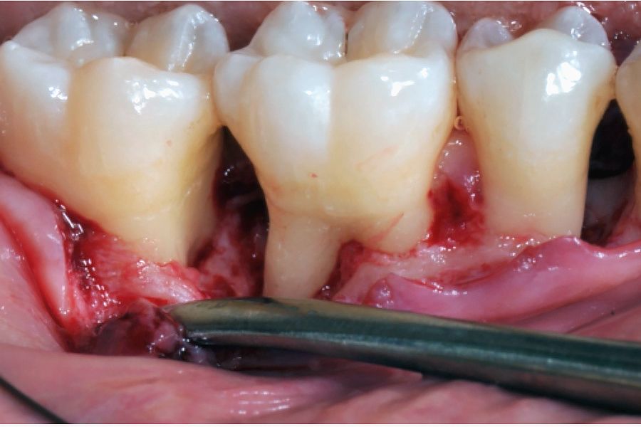 Bei einem systemisch gesunden 33 Jahre alten Patienten wurde eine lokal begrenzte aggressive Parodontitis diagnostiziert. Auf einer präoperativen Röntgenaufnahme (Abb. 1) wurde ein infraalveolärer Defekt auf der distalen Seite von Zahn 46 und auf der mesialen Seite von Zahn 45 festgestellt. Nach der Erstpräparation zeigte sich distal des Zahns 46 eine 10 mm tiefe residuale Parodontaltasche und mesial des Zahns 45 eine 7 mm tiefe Parodontaltasche (Abb. 2-3).