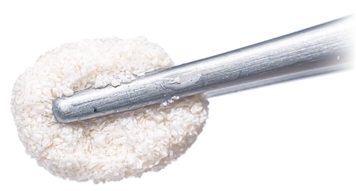 En utilisant uniquement de la chaleur et de l’eau, le processus de chauffage à 1 200 °C de cerabone® élimine tous les composants organiques et conduit à une substance osseuse minérale naturelle pure. Une irradiation aux rayons gamma assure la stérilité finale de cerabone® plus.
