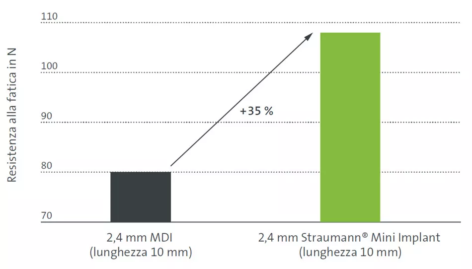 Gli impianti mini Straumann® realizzati in Roxolid® presentano una resistenza alla fatica più elevata del 35 % rispetto ai mini impianti della concorrenza.