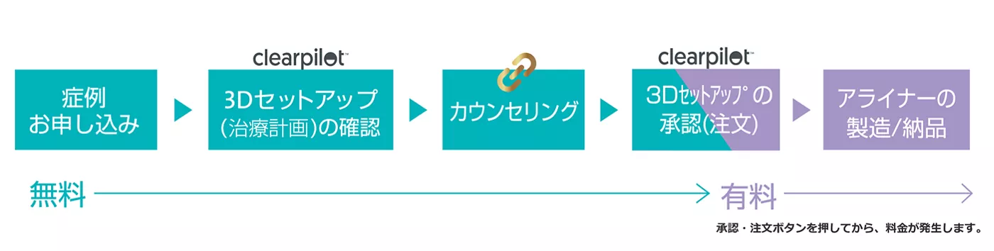 クリアコレクトのマウスピース矯正は、ドクターポータル、クリアパイロットを使用して3Dセットアップを作成し、承認(注文)ボタンを押すまで、どのプランでも症例の申込は無料で行なえます。