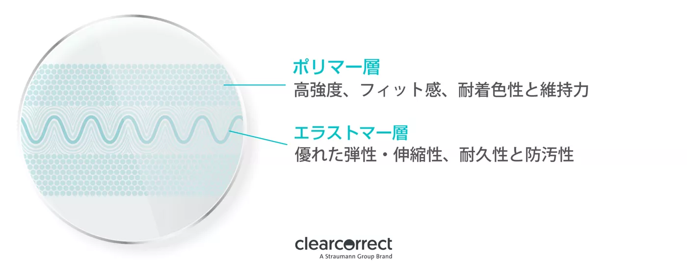 クリアコレクトのマウスピース矯正の素材は、弾力性のあるエラストマー層に耐久性のある2層のポリマー層が挟まれた3層構造から出来ています。