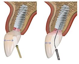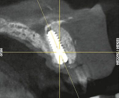 Die im Frontzahnbereich geforderte spezifische Implantatposition und die Notwendigkeit eines Schraubenzugangs auf der Palatinalfläche des Zahns machen es mitunter problematisch, innerhalb der Knochenanatomie der Prämaxilla zu platzieren. Die Folge einer solchen Position ist eine enge Lagebeziehung des Implantatapex zur vestibulären Kortikalis, verbunden mit der Gefahr einer Knochenfenestration (operativer Eingriff mit dem Ziel, ein Fenster in den Knochen zu bohren) und deren Folgen (Abb. 3).