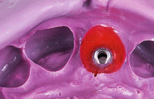 Der Einsatz neuartiger provisorischer oder definitiver implantatprothetischer Komponenten mit Achsenkompensation gestatten es nun in vielen Fällen, die Schraubenzugangsöffnung auf die Palatinalfläche des Zahns zu bringen. Damit wird ein ästhetisches Erscheinungsbild sichergestellt und die gesamte implantatprothetische Rekonstruktion kann innerhalb der Konturen des ersetzten natürlichen Zahns und seines Alveolarknochenvolumens zu liegen kommen (Abb. 4).