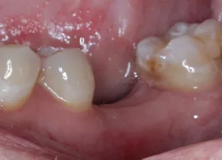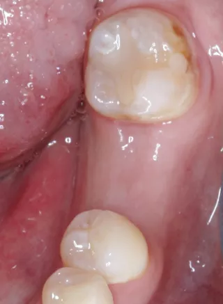 Der 40-jährige, gesunde Patient wurde uns durch seinen Hauszahnarzt mit einer seit mehreren Jahren bestehenden Lücke regio 36 vorgestellt (Abb. 1, 2). Die Nachbarzähne zeigten sich gesund bzw. mit stabilen zahnärztlichen Restaurationen. Trotz der langen Wartephase nach Zahnverlust durch einen progredienten, endodontischen Prozess, war die Schaltlücke ohne Kippung der Nachbarzähne frei und mit der Gegenbezahnung stabil abgestützt. Die Sondierungstiefen der Bezahnung lag in Ober- wie Unterkiefer bei 2 mm (2-Punkt-Messung). Das Weichgewebe in der Lücke zeigte einen ca. 6 mm breiten Saum der attached Gingiva.