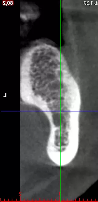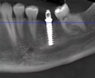 Die 2-dimensionale radiologische Voruntersuchung durch den Hauszahnarzt ergab eine auf den ersten Blick ausreichende ossäre Basis, sodass als Planung eine implantologische Versorgung der Schaltlücke vorgesehen wurde - entsprechend dem Wunsch des Patienten (Abb. 3).