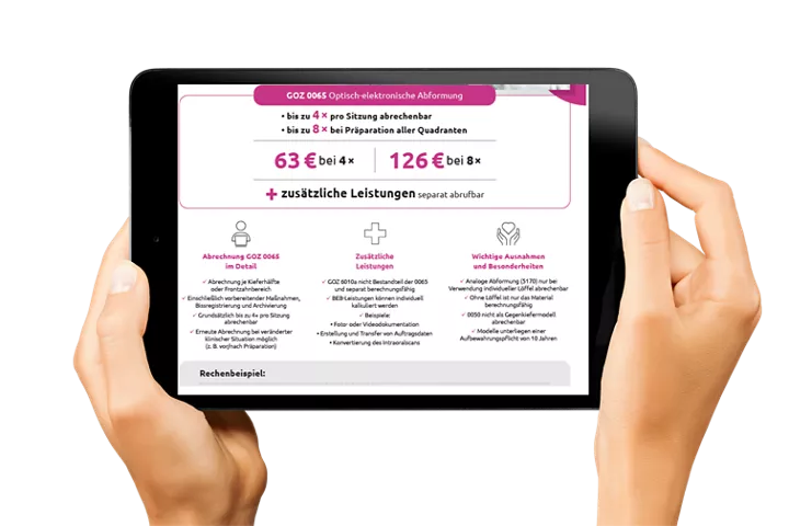 Damit Sie das Potenzial Ihres Intraoralscanners auch wirtschaftlich optimal nutzen, finden die wichtigsten Abrechnungsinformationen kompakt zusammengefasst – inklusive relevanter GOZ‑Positionen und Praxisbeispiele!