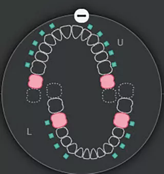To ensure that retention was observed, a maximum movement of 0.2 mm per aligner was planned³,⁴, although the standard for distalizations with ClearCorrect® is 0.3 mm per aligner. Staging and thus also the speed at which the teeth move were adjusted by appropriate instructions in the prescription.