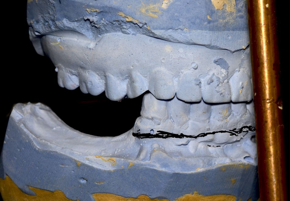 Study models were created and mounted in articulation at the existing vertical dimension, which was appropriate enough to proceed with the proposed treatment plan as there was no loss of vertical height or a collapse (Figs. 4-6). The study models were also duplicated to fabricate a diagnostic wax up for the lower jaw at the centric relation to outline the teeth set up for the immediate provisional prosthesis (Figs. 7-8).