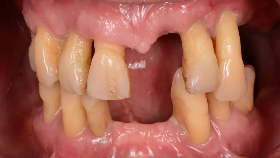 Initial situation: 60-year-old male, healthy, no bone defects. Moderate resorption in the mandible and maxilla. Generalized severe chronic periodontitis.