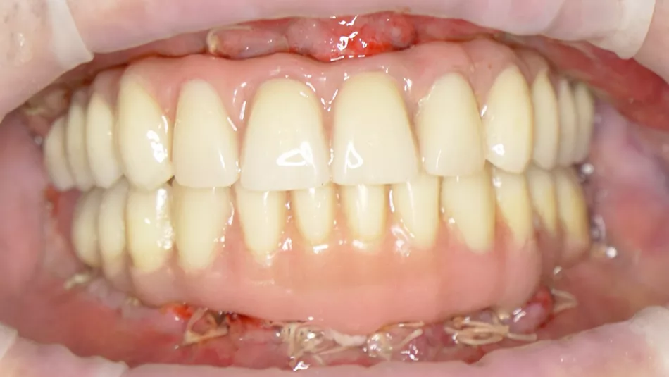 Treatment: Fixed immediate rehabilitation on four implants in the mandible and six implants in the maxilla. Tilting of the posterior implants due to limited bone availability in the maxilla. Temporary restoration: acrylic, metal-reinforced provisional prosthesis. Planned final restoration: zirconia ceramic bridge.