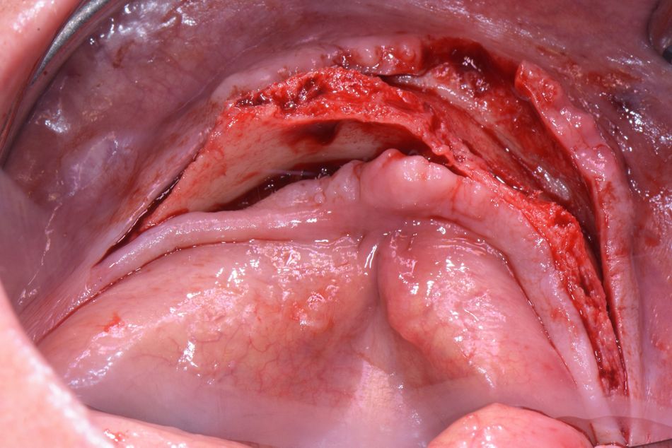 Due to the thin bone crest, immediate loading was avoided by grinding resin from the existing prosthesis to prevent contact with the transgingival part of the implants during the healing phase.