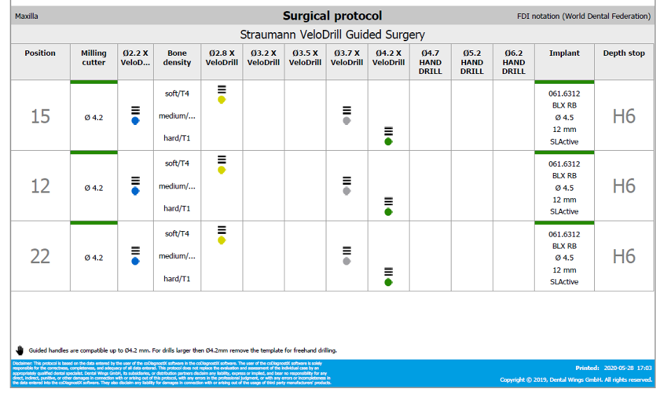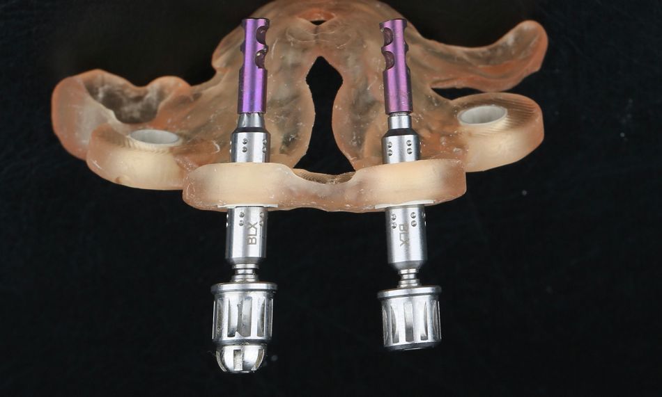 On the day of surgery, we prepared the surgical protocol provided by the implant planning software, which guided us on the drilling sequence and the use of the appropriate instruments for the implant bed preparation (Fig. 30a- 30b). After the fixation pins were allocated, the teeth # 17, #16, #15, #13, #12, #22, #23 and #24 were atraumatic extracted and followed by alveolectomy, using a bone reduction guide (Fig. 31-36). Four implants (Straumann® BLX ø 4.5 mm RB SLActive® 12mm Roxolid®) were placed, two straights in the anterior zone and two titled implants in the posterior zone. All implants were stabilized with a torque of 50 N/cm (Fig.37-43) and the SRAs were placed on top, with an angulation of 30º on the posterior implants (angled 30°, ø4.6 mm, GH 3,5) and 17º on the anterior implant (angled 17°, ø4.6 mm, GH 3,5) (Fig. 44-45).