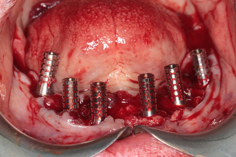 On the day of surgery, we prepared the surgical protocol provided by the implant planning software, which guided us on the drilling sequence and the use of the appropriate instruments for the implant bed preparation. After the fixation pins were fully engaged, the teeth were atraumatically extracted at mandible and maxilla (Fig. 12, 13) and a controlled alveolectomy (Fig. 14) conducted, using a bone reduction guide. The lower arch had six straight implants (Straumann® BLX SLActiveRoxolid®) placed (Fig. 15), All implants were stabilized with a torque of 50-60 N/cm and the straight 1.5mm height SRAs were placed on top.