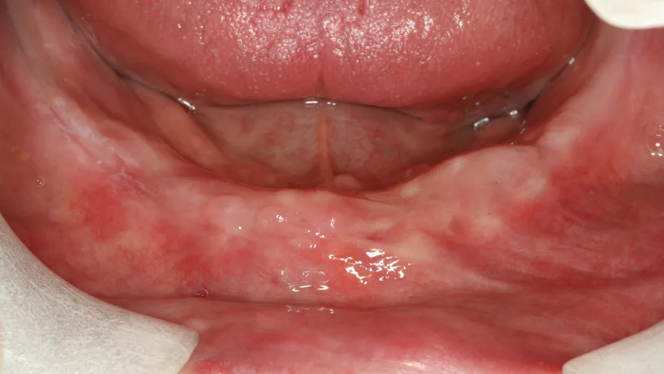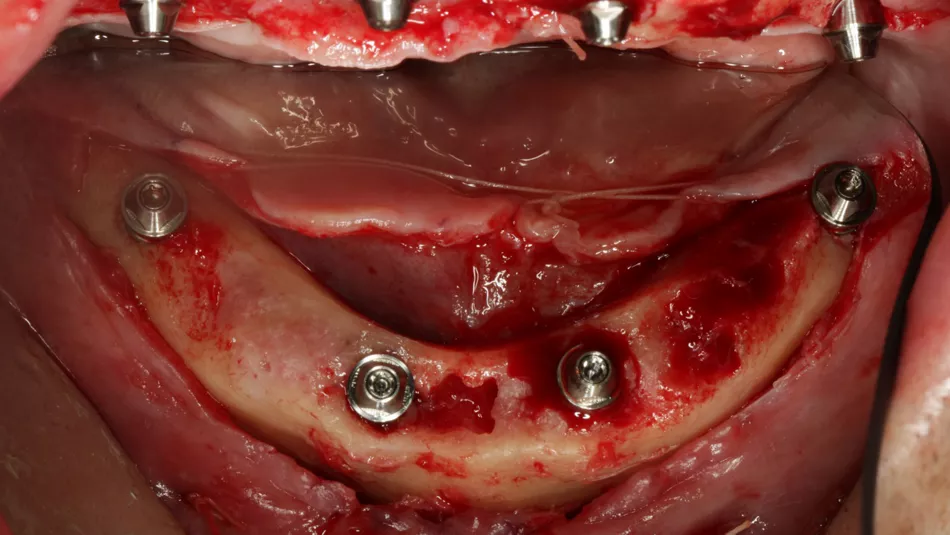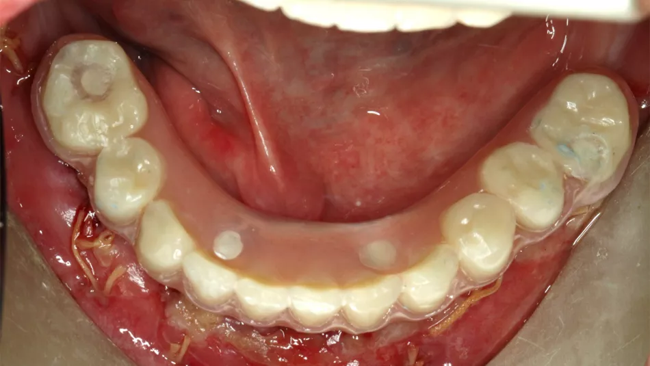 Treatment: The treatment plan was performed with a computer software and included the use of four straight Straumann® BLT implants in the lower jaw. Following local anesthesia, and a mid-crestal incision was done. The flap was raised with minimal trauma, the inflamed tissue was removed, and the bone level was adjusted. The implant bed was prepared with the help of a guide and the manufacturer’s protocol was followed. Two implants were placed behind the mental foramina and two in front of it, providing an ideal spread. The placement of implants in resorbed bone led to the need of bone augmentation around the exposed surfaces of the implant. After the surgical procedures, the bite registration was performed, and the impression was sent to the laboratory. Couple of hours later, the temporary prosthesis was placed on the patient and the occlusion was checked.