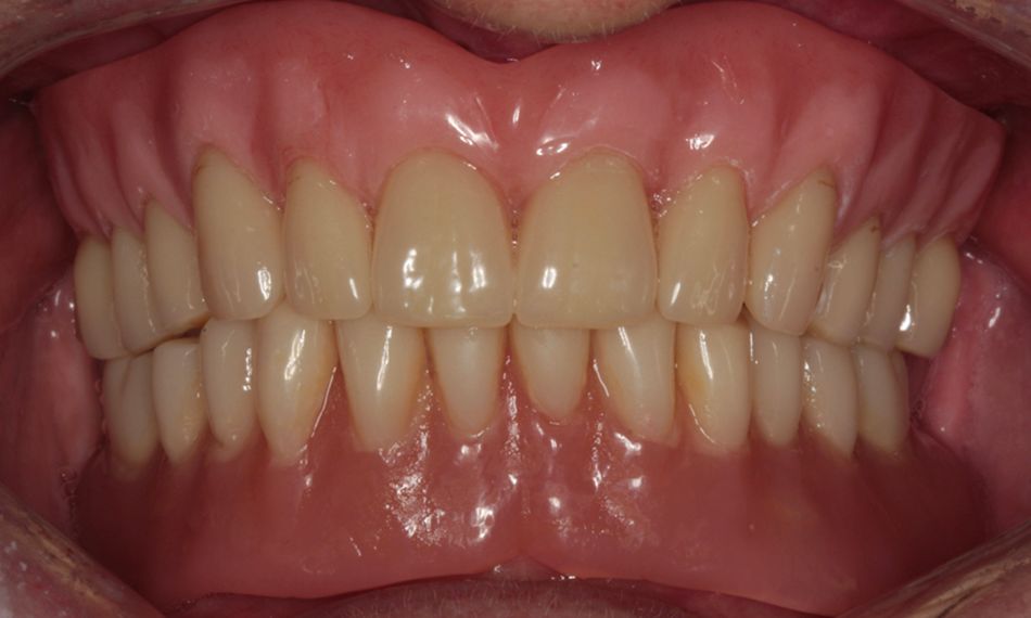 A systemically healthy, non-smoking 64-year-old female came to our clinic requesting a solution to improve her smile esthetics and masticatory function. She stated: “I am looking for a non-invasive solution for my mouth. I no longer tolerate the adhesive glue to hold the lower denture in place, and continuous direct and indirect relines have been unsuccessful.” She reported wearing full-arch dentures in the upper jaw for 15 years and in the lower jaw for 40 years.
