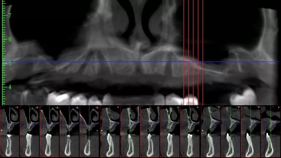 At the six-month follow-up, a CBCT scan revealed that the augmented bone had fully integrated, providing the necessary dimensions and stability for implant placement (Fig. 10). Using digital planning software, the 3D positioning of the implants was meticulously planned to ensure optimal placement (Fig. 11). This meticulous planning ensures accurate angulation and depth of the implants, significantly improving both functional performance and esthetic outcome of the final prosthesis.