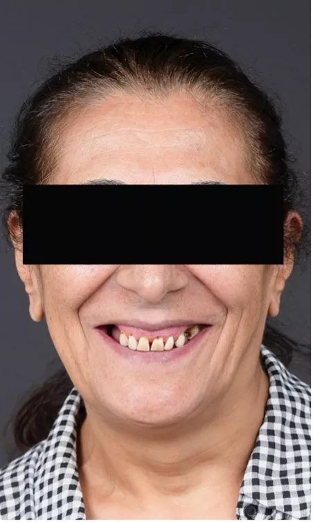 A 65-year-old female patient presented with significant difficulty in eating and speaking. She reported that these functional limitations had a considerable impact on her quality of life, affecting both her social interactions and self-esteem. The patient expressed dissatisfaction with the appearance of her smile and reported avoiding smiling in public due to a lack of confidence (Fig. 1).