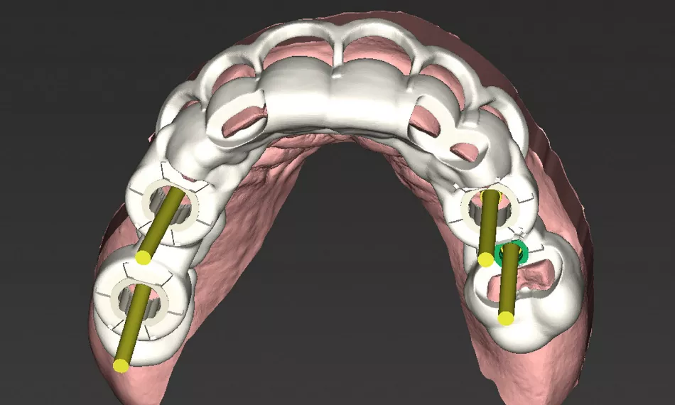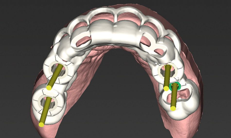 Step 2: Virtual implant positioning and surgical guide design were performed using the coDiagnostiX® implant planning software, including guide design for four upper implants and crown lengthening with bone removal (Fig.6). Due to insufficient space for two regular guide sleeves in the left posterior maxilla, we used a 2,8 mm sleeve for site #25 and regular 5 mm sleeves for the remaining implant sites.
