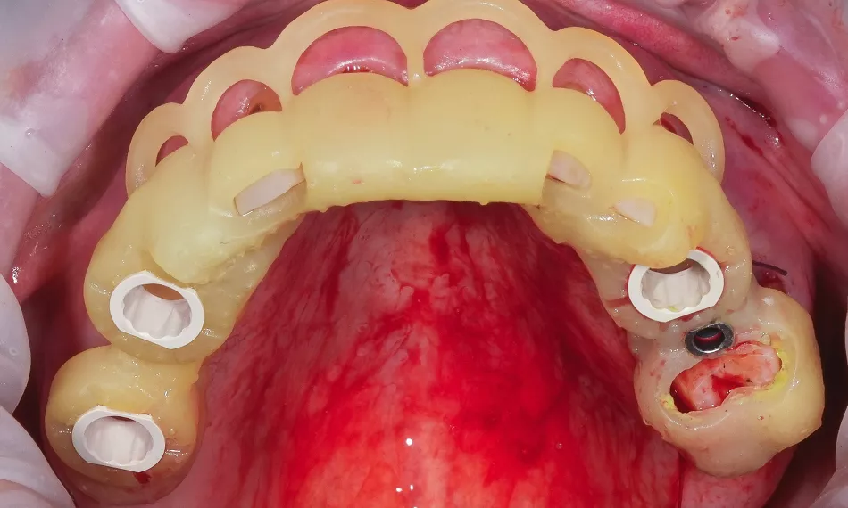 Prophylactic antibiotics were prescribed prior to surgery. Local anesthesia was administered to both the maxilla and mandible. Regular crestal incisions were performed to access the alveolar ridge. The guided surgical guides were then positioned, and their fit and stability were verified (Fig. 7).