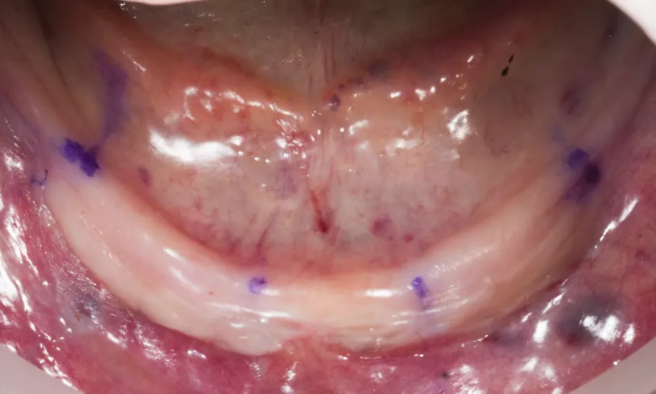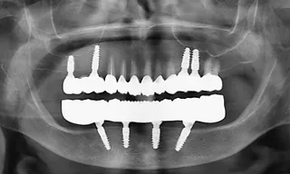 The patient had lost all mandibular teeth several years ago and reported discomfort from ill-fitting dentures that moved during eating. She had also undergone several extractions in the maxilla, resulting in partial edentulism in the upper arch.